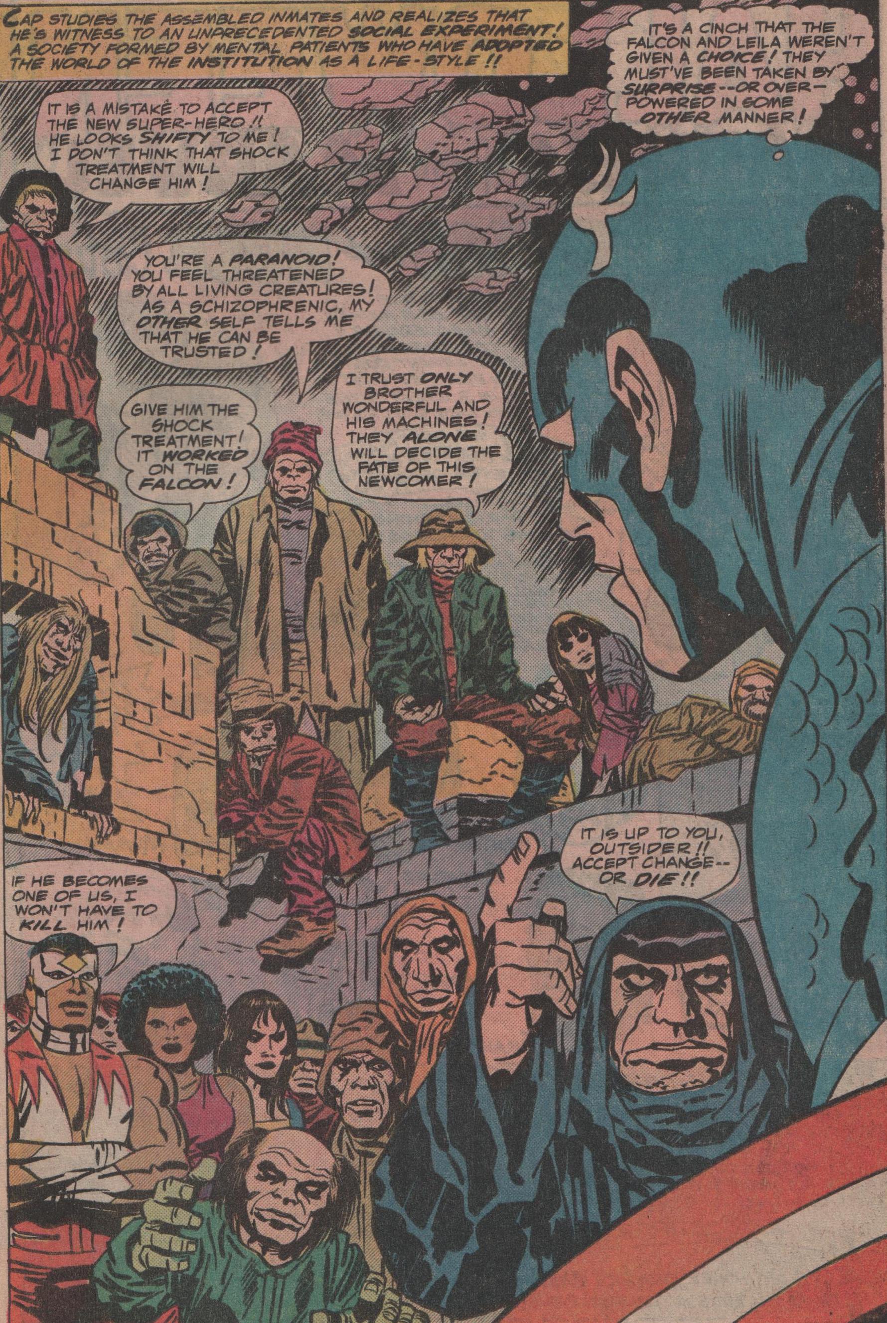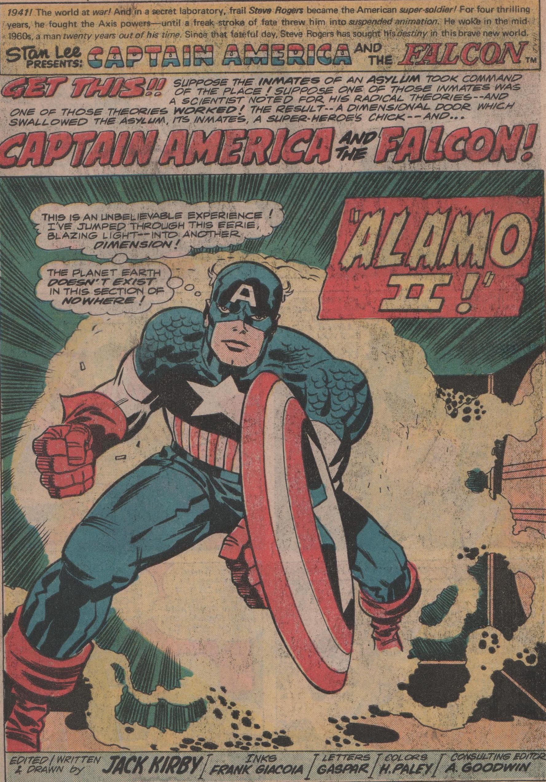 Another day, another post! And another great one from the ‘King’! No matter how many times I see an image of Captain America drawn by Jack Kirby, it still gets me pumped up about the star-spangled Avenger! It’s true, and in this adventure, Cap is searching for Falcon and Leila Taylor. He finds them, but they don’t recognize him. We then get a brawl between Cap and Falcon, and the following pages are some more Kirby magic! One splash page in particular sticks in my head, never to leave! It shows a scene of enthralled people (including Leila and Falcon), some of them sitting on a stone wall. Just the atmosphere alone is incredible!