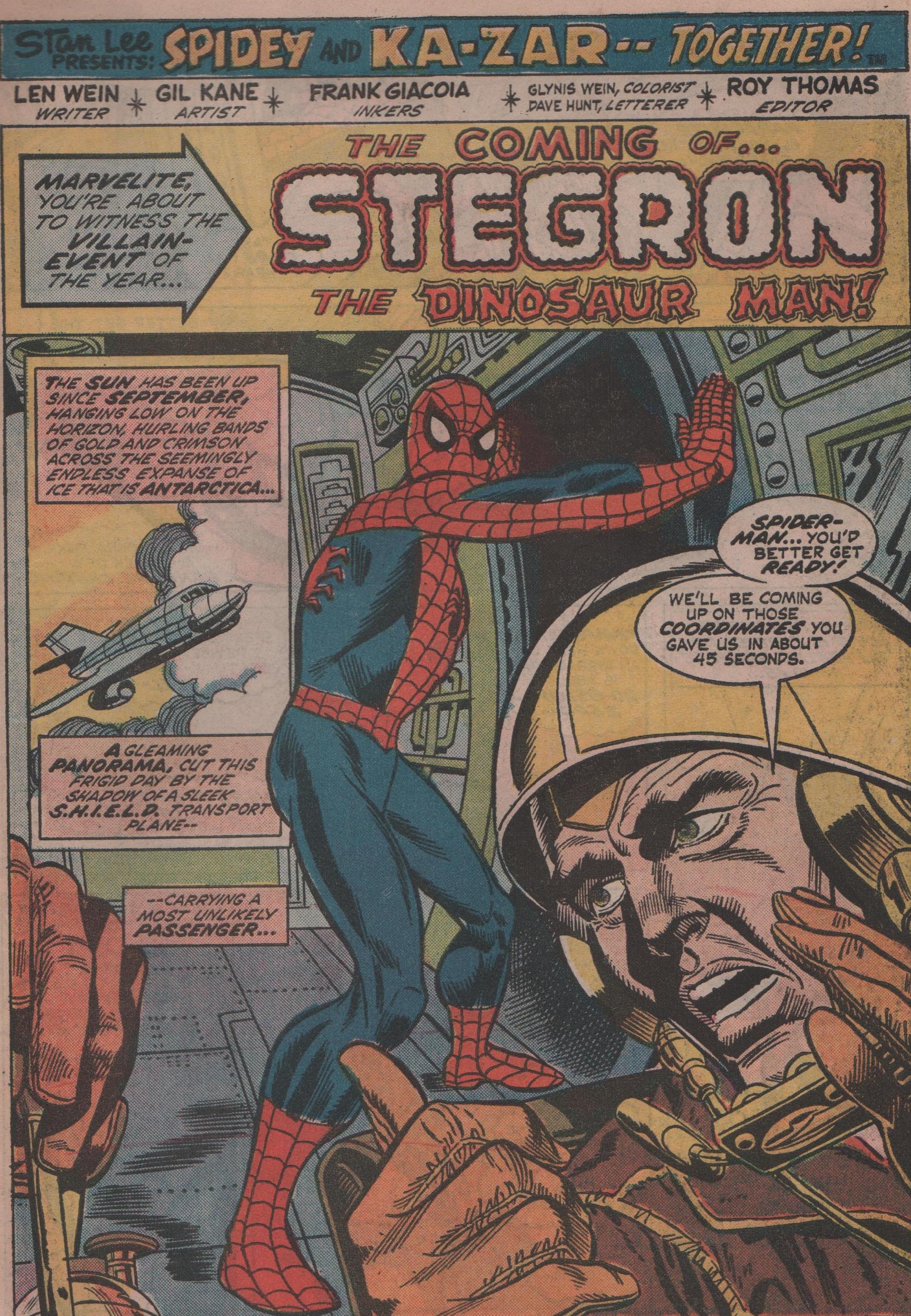 You know, I don’t remember being a huge dinosaur enthusiast as a youth, but my son definitely is/was. He knows more facts about them than I’ll ever know or understand, and his love and knowledge of dinosaurs is something that not only fascinates me, but is utterly endearing as well. In this especially awesome issue of MTU (Marvel Team-Up #19), Spidey must journey to the Savage Land, and of course almost immediately meets up with the Lord of the Hidden Jungle, Ka-Zar! The trip ends up being a bit more complicated than Spidey wanted (of course, that Parker luck!), and we are introduced to a new villain, Stegron the Dinosaur Man!