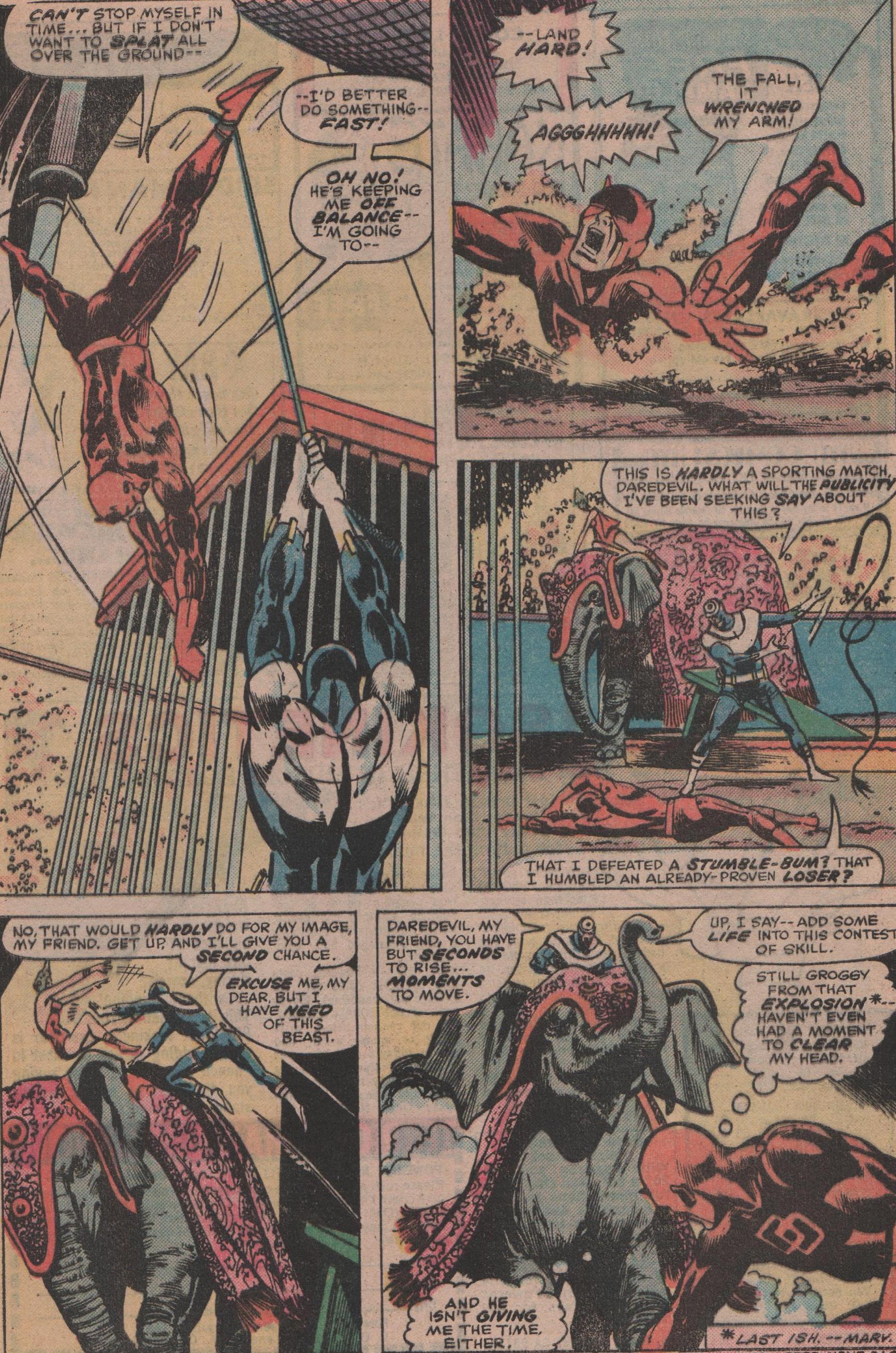 This issue is one of the oldest issues of Daredevil that I own. It’s also the second appearance of Bullseye! The first appearance showed Bullseye giving old horn-head a butt whoopin’! But, in this issue, we see Matt get some revenge, and put this crazy villain in his place! At a circus, no less! Back then, Bullseye wasn’t quite as homicidal as he’s portrayed later on by Frank Miller, and other writers, but he certainly wanted to kill Daredevil! In this issue we see everything, from Bullseye riding an elephant (yes, seriously!), and then him shooting another man out of a canon at DD! Created by Marv Wolfman (writer) and Bob Brown (pencils), Bullseye brought something new to the table, and obviously he’s been a mainstay in the Marvel Universe ever since! Inks by Klaus Janson, colors by Michele Wolfman, and letters by Joe Rosen! Great cover as well, and we have Rich Buckler and Dan Adkins for that one! On Friday the 13th, is there anything more frightening than Bullseye riding an elephant? I think not! Enjoy!