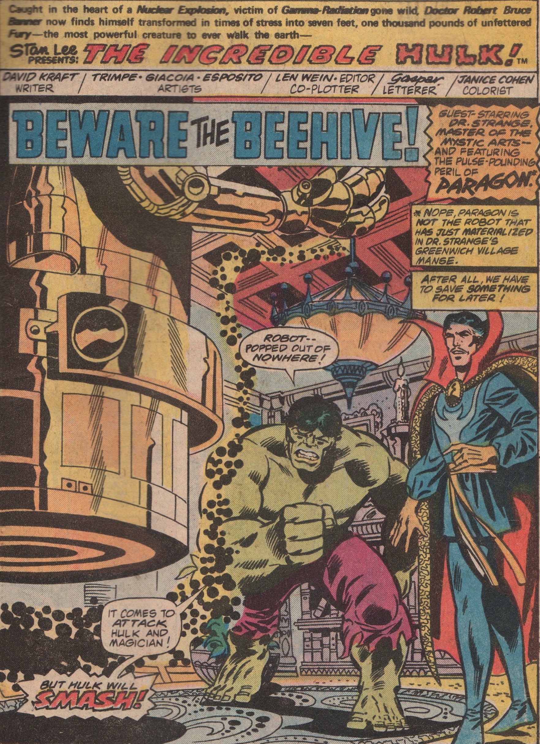 This recent grab was…grabbed mostly for one reason- the appearance of Dr. Strange! Not that I don’t like the Hulk, I do, just more so in the pages of books like The Defenders, and The Avengers. I also love the “Beehive” and their insidious plots! In their second attempt at creating a god-like being, they unleash an even more powerful creature that initially tries to kill Dr. Strange! The old Doc has a difficult time with the man-made entity, but the Jade Giant is on his way to smash!