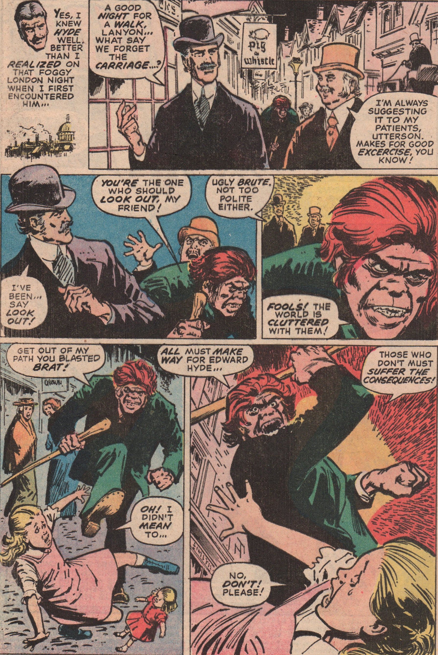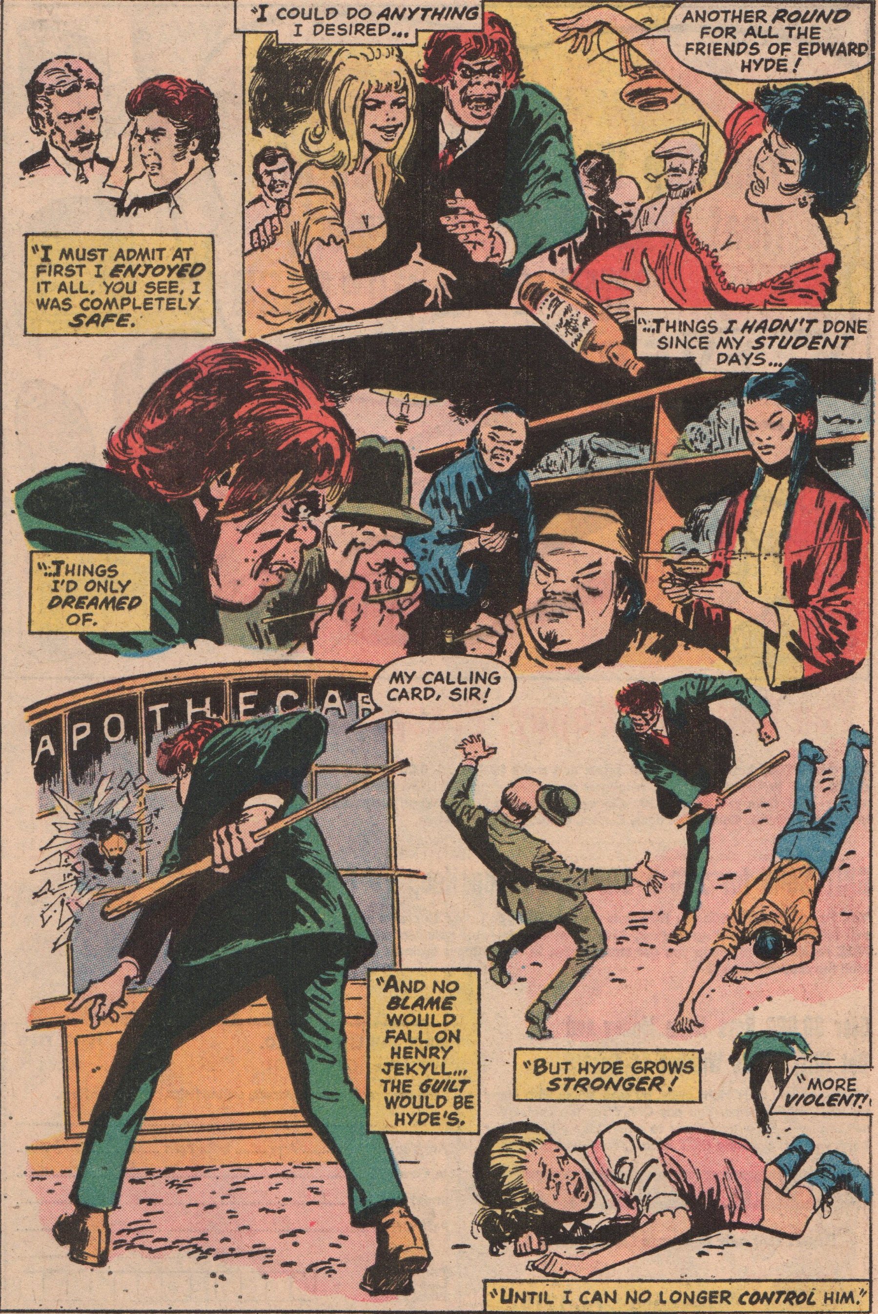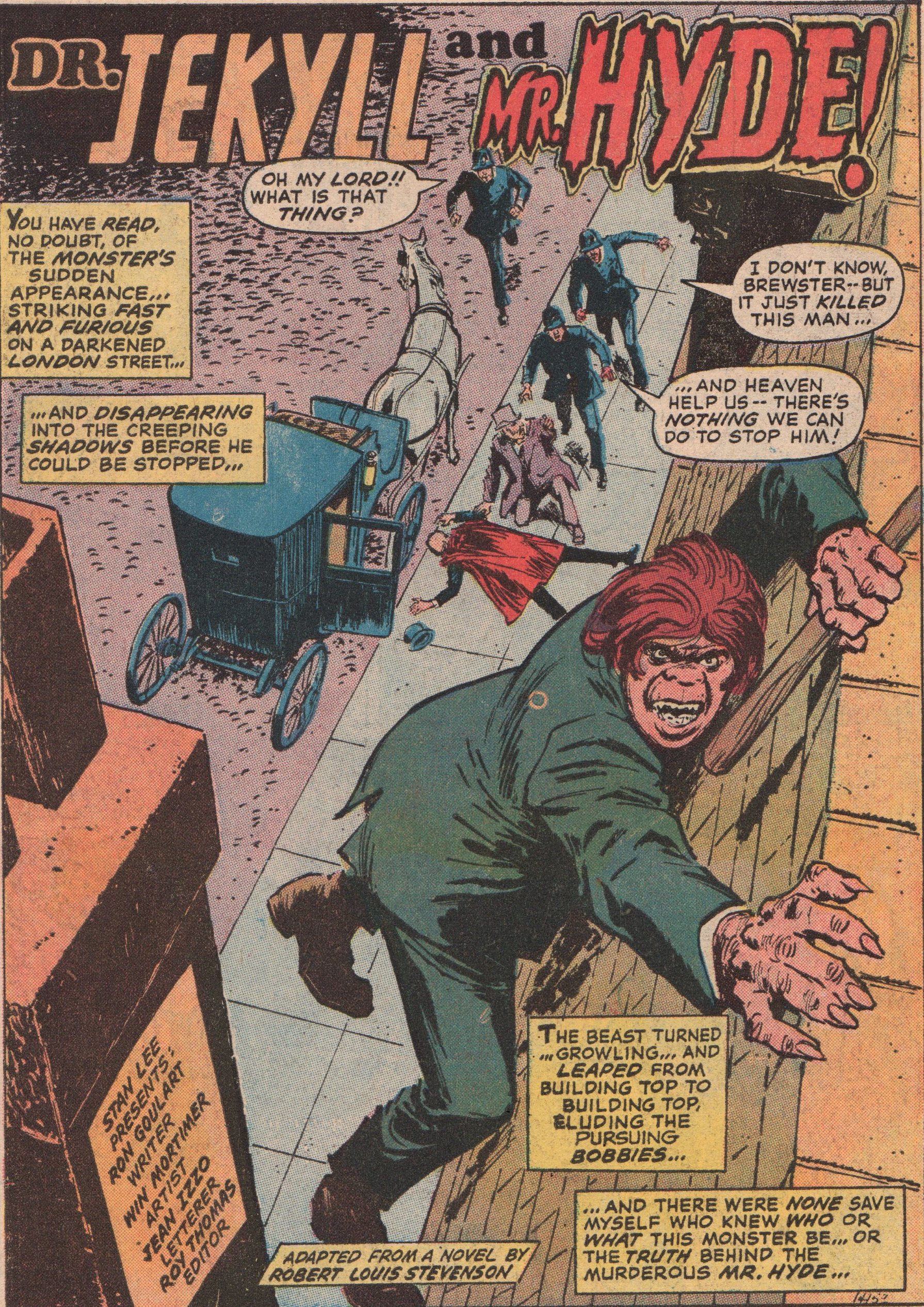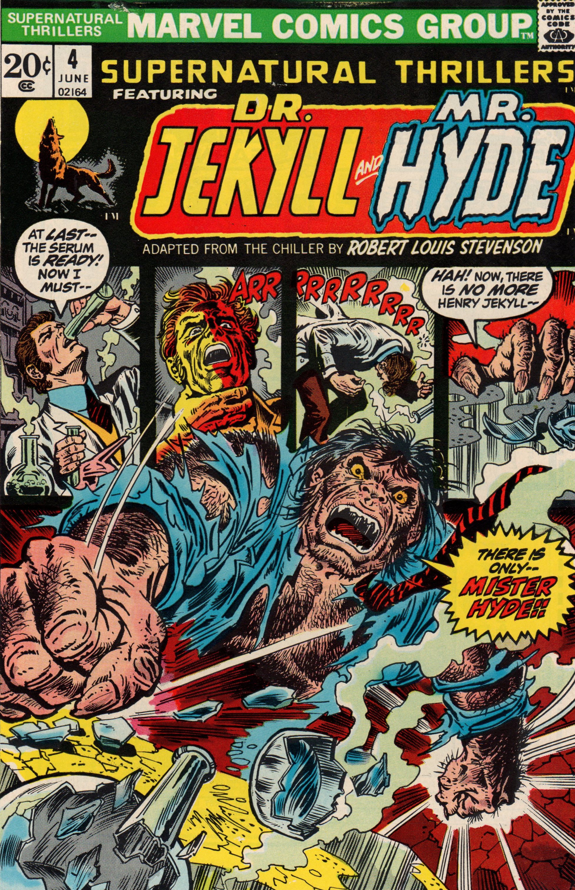 The title “Supernatural Thrillers” is probably most known for the Living Mummy character, but its beginnings were quite different. The first four issues contained stories based off of classic monsters! This one in particular is an adaptation of the classic story by Robert Lois Stevenson, Dr. Jekyll and Mr. Hyde! The story revolves around a certain doctor that is having a crisis of conscience. He believes that his scientific endeavors trump any sort of morality. Hammer Studios did a movie adaptation that was marvelous, so definitely check that out!