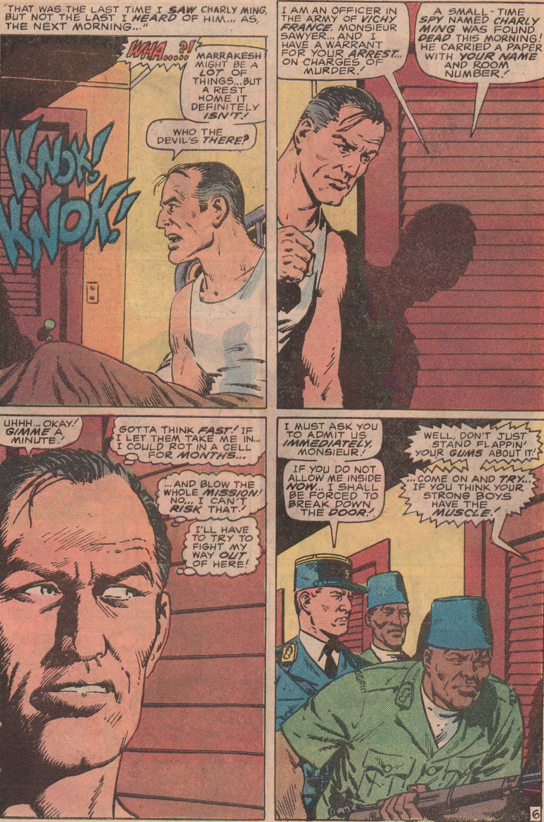 Every once in a while, I feel the urge to spotlight a war/military comic. One of my favorites is Sgt. Fury and His Howling Commandos! I’ve always loved the concept of a rough and tumble team that could handle anything. The mixture of personalities, and different ethnic backgrounds was pretty cool. There were down times with humor and fun, but when it was time for action, they were ready! This issue in particular was good because not only was the regular cast there but also their CO (Commanding Officer), Happy Sawyer! In this story (a bit of a Casablanca rip off), we see Sawyer remembering a mission that saw him fighting everyone from Arabs, French, and Nazis!