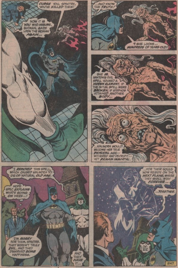 I’ll come right out and say it, I’m not a huge fan of The Spectre. Probably because I haven’t read very many of his appearances. Batman however, is a different story! In this penultimate issue of the series, we see the Spectre separated from Jim Corrigan (the two were sort of bonded together for most of the character’s existence). Two magic users (Kalindra and Stephos) kidnap Jim Corrigan, and The Spectre (isn’t he supposed to have cosmic awareness?) needs to locate his host (Corrigan), so he enlists the help of the greatest living detective, Batman! It isn’t long before the heroic duo find where Corrigan is being kept, and then the two begin to clean house.