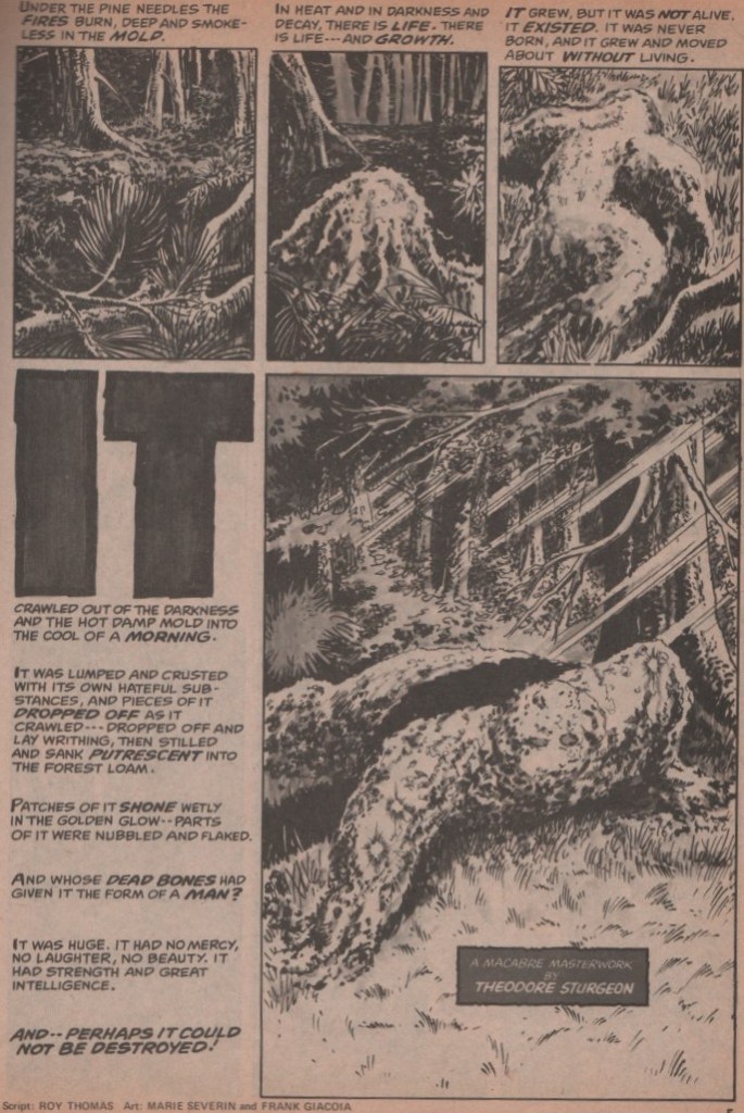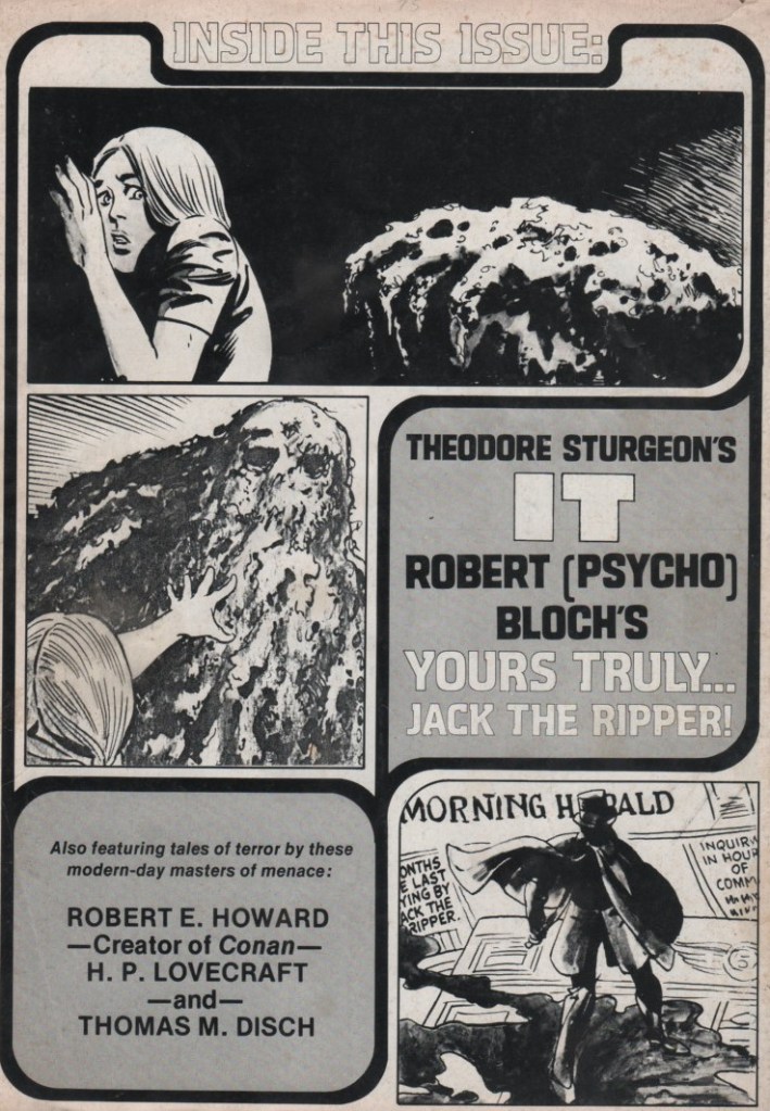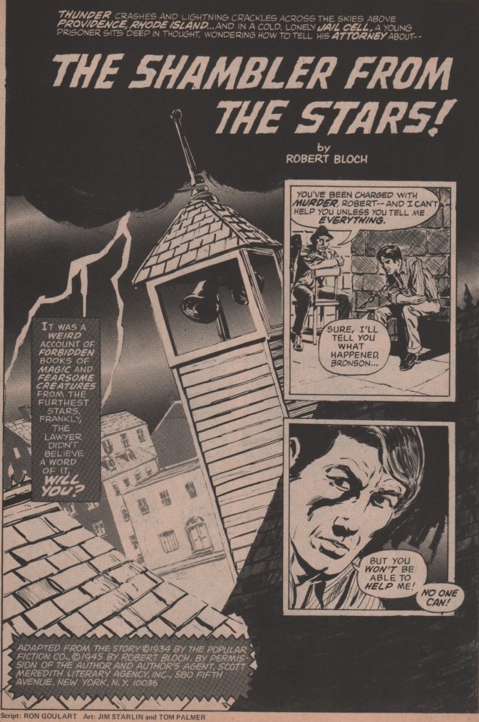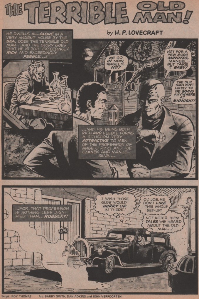 The artistic talent is a murderers row if there ever was one. Marie Severin and Frank Giacoia show us a monster (It! adapted by Roy Thomas) that definitely inspired The Heap, Man-Thing, and Swamp Thing! The second tale is brought to us by Frank Brunner (story adapted by Gardner Fox), and anyone that’s read this blog (or anything else I’ve written about him)knows how much praise I’ll heap on the artwork of Frank Brunner (his collaboration with Steve Englehart on Dr. Strange/Marvel Premiere is a masterpiece). The Lovecraft adaptation has Roy Thomas scripting, and a powerhouse team on art that includes Barry Smith, Dan Adkins, and John Verpoorten! The next adaptation is scripted by Ron Goulart, and the art team is the incredibly talented duo of Jim Starlin and Tom Palmer! Finally, Ron Goulart, Gil Kane, and Ralph Reese bring a story about Jack the Ripper!