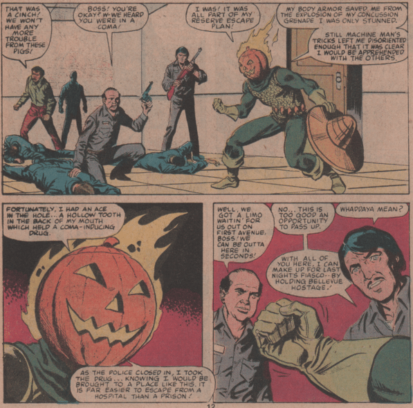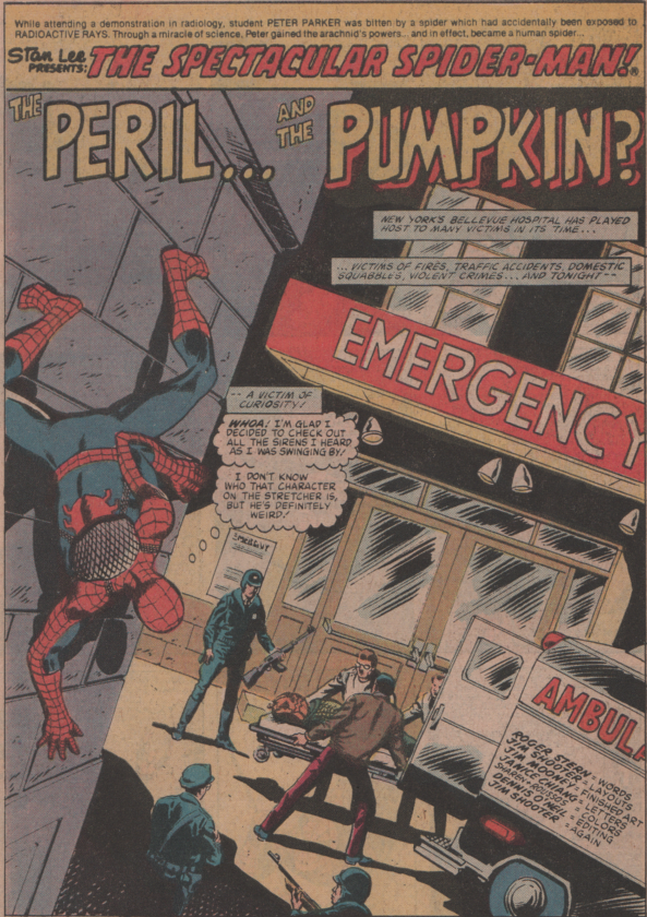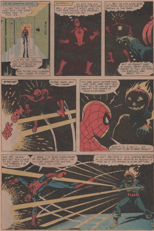 This story revolves around the second appearance of Jack O’Lantern, and his rampage in NYC (stemming from his first appearance in Machine Man 19…believe it or not!). The interior art and story is literally a murderers row of talent. The story is by Roger Stern, who wrote some excellent Spidey stories in the 1980s (along with Captain America, Dr. Strange, The Avengers etc.). The layouts are by the former EIC himself, Jim Shooter! The finished art is by a comic book mainstay and a very underrated guy, Jim Mooney. Colors by Bob Sharen and George Roussos, letters by Janice Chiang, and edited by another giant of the industry, Denny O’Neil!