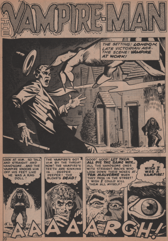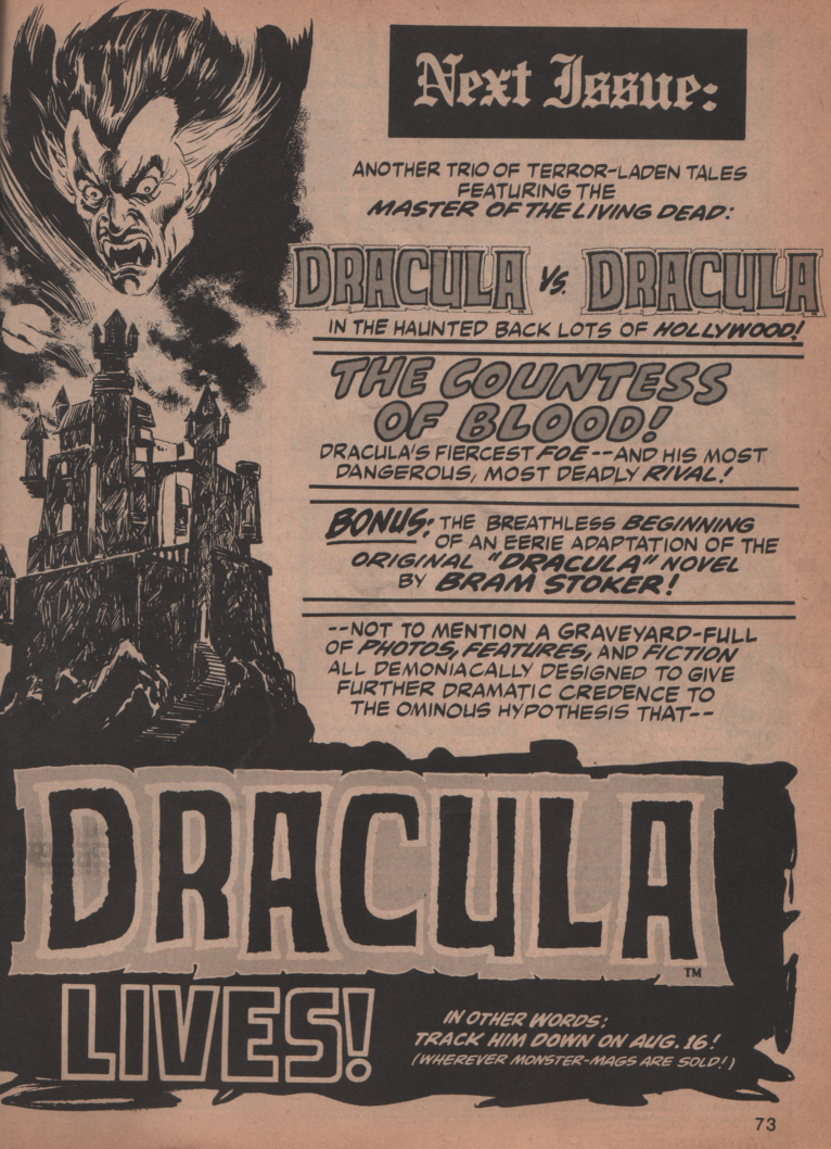 The Dracula story is one that dives into the history of the character in reference to the actual continuity of the Marvel Universe (written by Marv Wolfman, and art by ‘Big’ John Buscema and Syd Shores). A battle with another vampire, Nimrod, to be specific, who was the previous lord of the undead. The second story is a reprint from the 1950s. It involves a vampire and a slasher, à la Jack the Ripper (art by Larry Woromay). This story is followed by a great puff piece about Bela Lugosi with some fantastic photos from his films (written by Doug Moench).