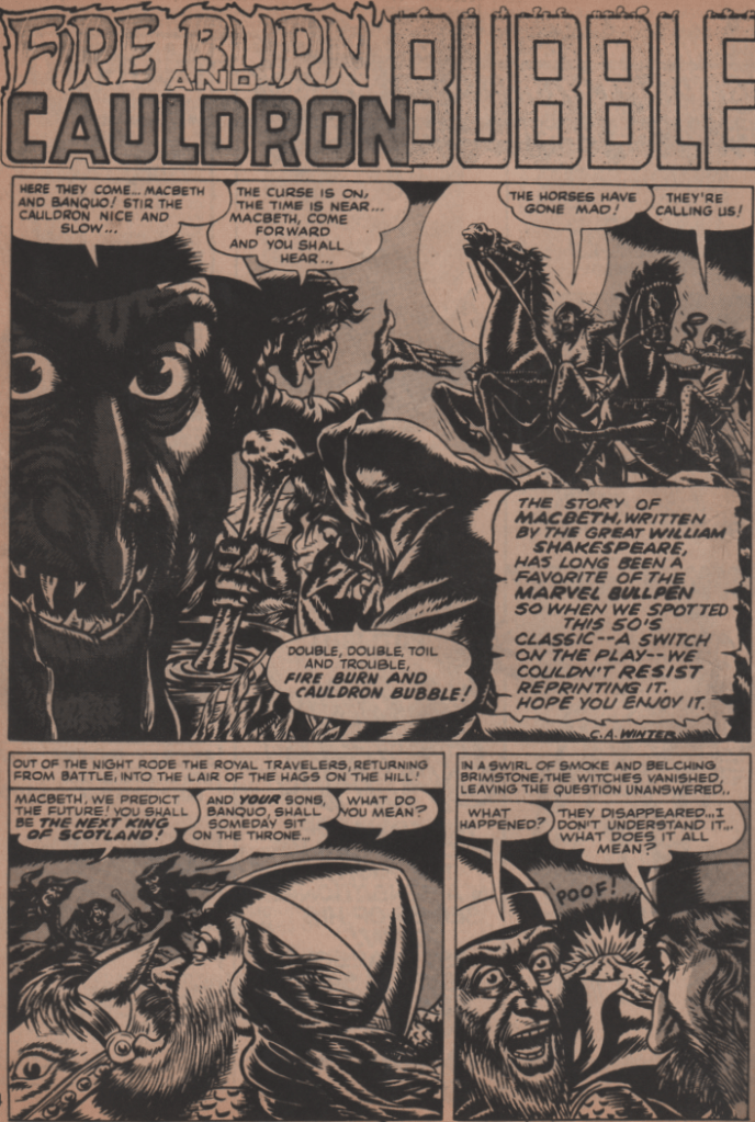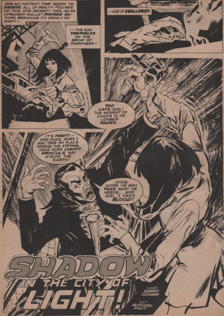 Next we have what is probably the best piece of the book. A story about a chance encounter between Dracula and the sword wielding Puritan, Solomon Kane (written by Roy Thomas, with art by Alan Weiss and the Crusty Bunkers)! Another reprint from the Atlas era follows with an interesting take on the Shakespeare story Macbeth (art by C. A. Winter). Finally, we get a super story about Dracula in Paris, and this time he must do battle with a stone gargoyle (written by Gerry Conway, and art by Alfonso Font)! There is also a neat story by Chris Claremont that features some love for Hammer studios! All of this is kicked off by a wonderful painted cover by Neal Adams!
