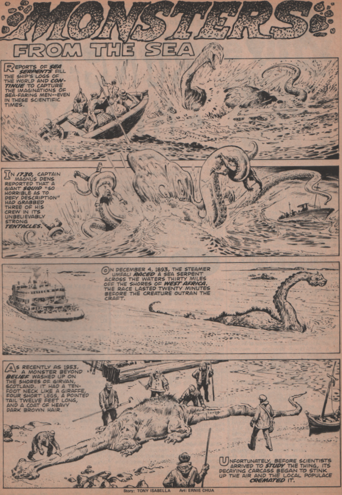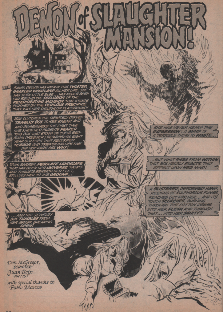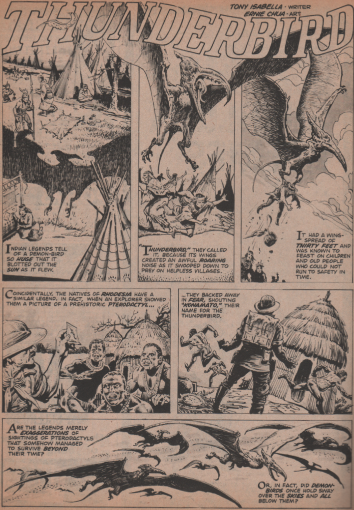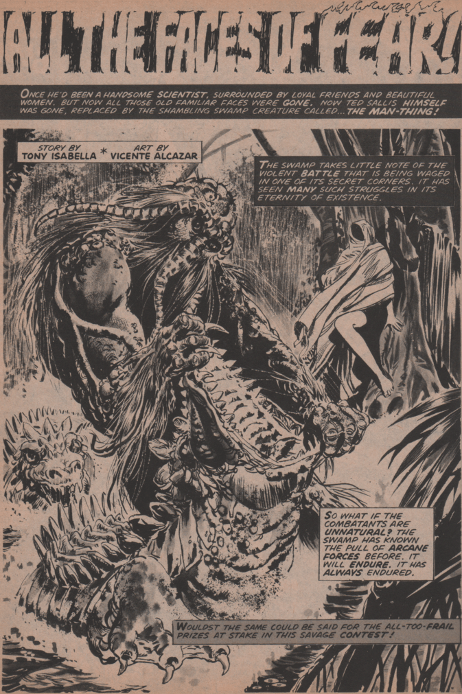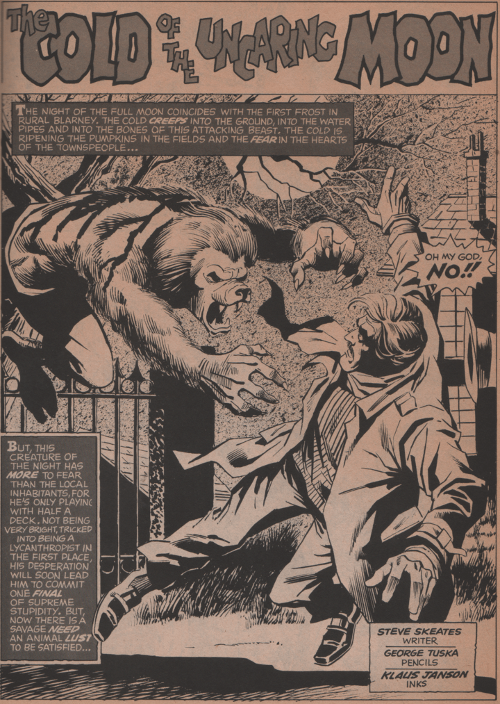 The cover is absolutely fantastic, and artist Ken Bald really brought his best to this one. He’s a guy that had worked since the Golden Age, and some of his covers are absolutely gorgeous (look them up!). The first full story (The Cold of the Uncaring Moon) is by Steve Skeates (writer), George Tuska (pencils) and Klaus Janson (inks). There’s nothing like a good werewolf story to get the mag started! Next, we get World of Warlocks! This one is brought to us by Roy Thomas and Gardner Fox (story/writers), and Gene ‘The Dean’ Colan (artist)! This incredible tale of fantasy is a great one! “Lifeboat” follows, and Spidey-scribe Gerry Conway (writer), and Jesus Blasco (art) shows us what terror really is! The writer of the next story, Don McGregor, is one of my favorites, and doesn’t really get credit for much other than his Black Panther work. The guy wrote some really good horror stories, and “Demon of Slaughter Mansion” with art by Juan Boix is no exception! “Birthright,” has a giant serpent-type creature terrorizing a jungle that inhabits most;y peaceful people. Roy Thomas (writer), Gil Kane (pencils) and The Crusty Bunkers (inks) bring us this tale of fantasy! What does Jack the Ripper and a werewolf have in common? Chris Claremont (writer) and Don Perlin (art) know, and they weave a tale to show us. Finally (almost), we see the notorious muck monster, Man-Thing, and he must face not only vicious alligators, but vampire bats as well! Story by Tony Isabella and art by Vicente Alcalzar. There are also three one-pagers “Thunderbird” “They Might be Monsters” and “Monsters from the Sea” by Tony Isabella and Ernie Chan (Pablo Marcos) on art for the They Might be Monsters story)!