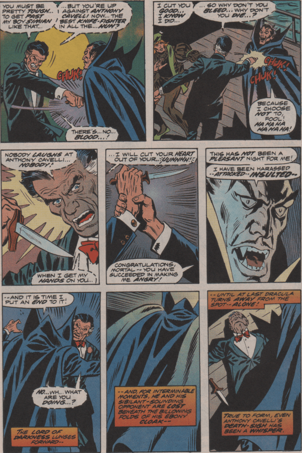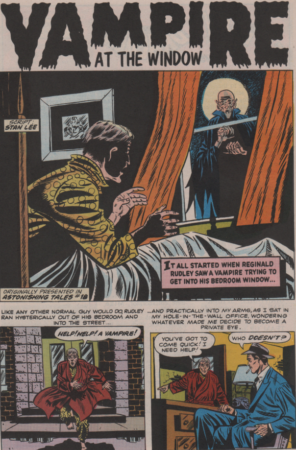 The cover for the original book is pretty good (John Romita, cover at the very bottom, borrowed from the interwebs), but the reprint isn’t the greatest. I’m not the biggest Joe Mad fan, (so keep that in mind) but I can’t imagine too many people thinking this is one of his (or anyone else) best. The story is by perennial comic book great, the late Len Wein. The man was seemingly one of the nicest men to ever grace the industry ( I met him once at a NYCC and he was cool), and created some very good content in his day, plus was editor on some of the best works in the industry. For the artistic duties, we have the team of Ross Andru (pencils) and Don Heck (inks). A solid team as far as this book goes for sure, and they tell a great visual story together. John Kalisz (colors) John Costanza (letters), and Roy Thomas (editor) round out the creative force behind this cool book! There are also two reprints from the Silver Age in the back as well and both are about vampires!