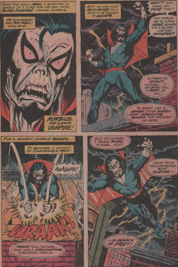 I’m not a big fan of the surprise “villain” or the deus ex machina in this one. That being said, I am a big fan of Archie Goodwin (writer/editor), and all the work he’s done over the decades. Whether it was his work for Warren Publishing, DC, or Marvel, he was always a reliable scripter. Next we have penciler Sal Buscema. Most people probably think of his run on Spectacular Spider-Man (with J.M. DeMatteis, and rightly so), but definitely seek out his work on The Defenders. His style fit that strange book perfectly. Inkers Jim Mooney (7), and Mike Esposito (8), are both a good fit for Sal’s pencils as neither takes away from them but adds their own touch. Letters on both issues were by John Costanza, and colors by Don Warfield (7) and Marie Severin (8), all add their usual talents to the books. The covers are both very good, as number seven has Dave Cockrum and Al Milgrom show the absolute ferocity of Morbius. The next issue has a young artist you should recognize in Paul Gulacy. He’s mostly heralded for his Master of Kung Fu work.