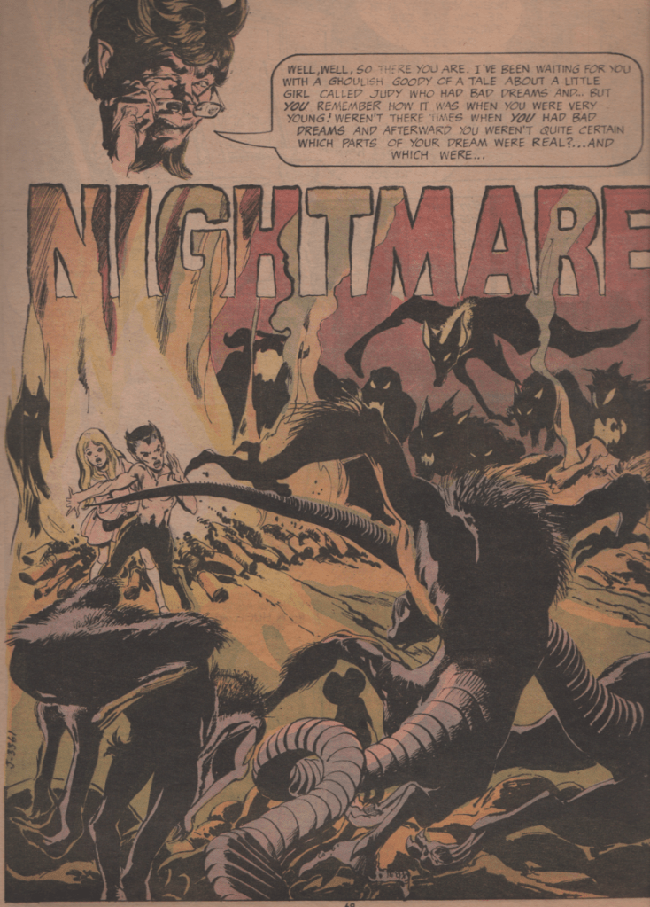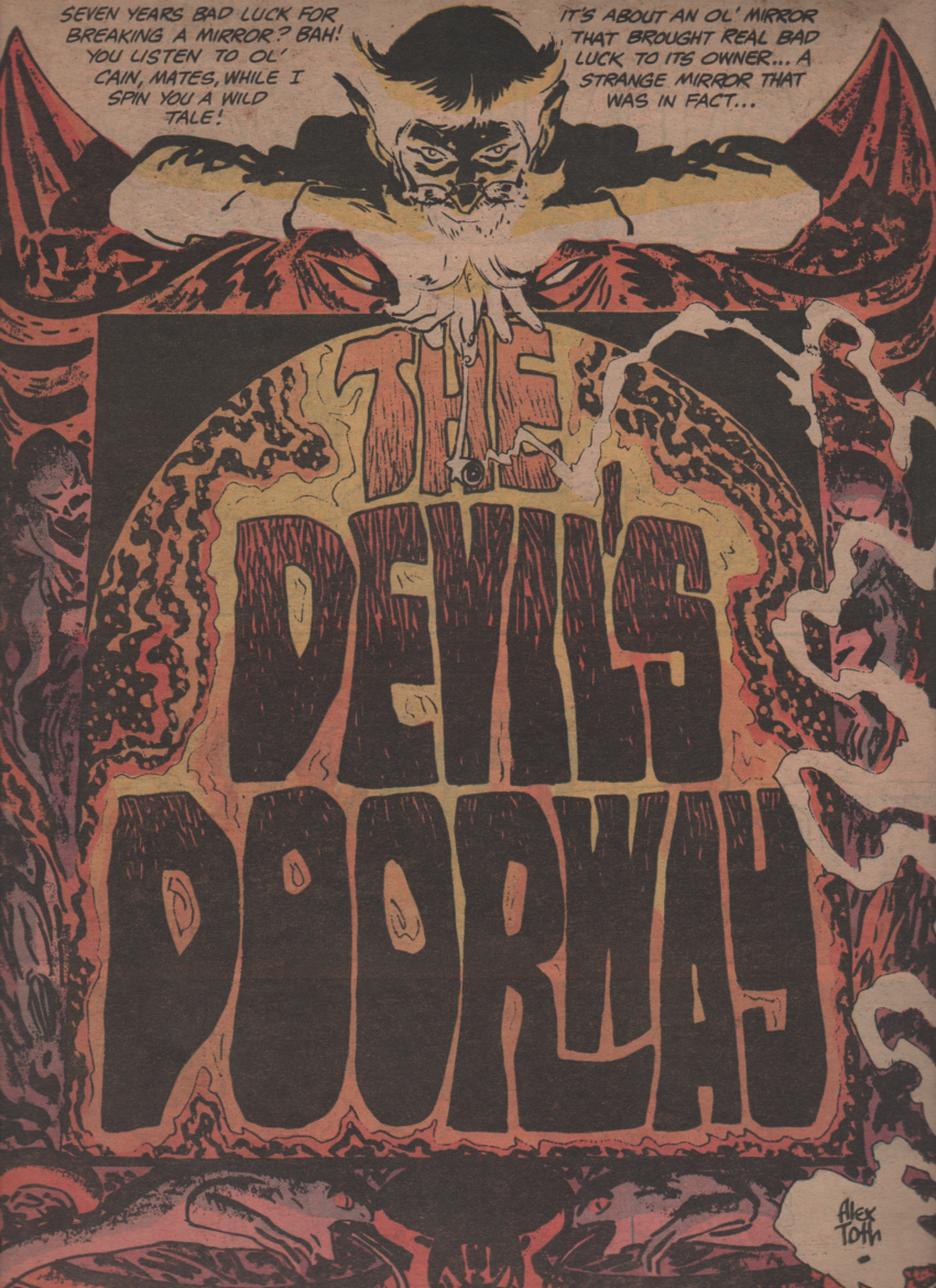 The third story (“The Widow’s Walk“) is another good one, with Howard Post scripting, and the art team of Neal Adams and Joe Orlando! Very good story top to bottom! We are then treated to a two-page splash of Cain by Wrightson (black and white version), and the image is absolutely stunning. A better, more iconic image really doesn’t exist in comics. Another story (“His Name is… Kane“) with another hall of fame artist follows, as Gil Kane (pencils) and Wally Wood (inks) bless us with an art combination for the ages. The script is by Mike Friedrich, who worked for DC and Marvel during his career. As if all of this wasn’t enough, enter Alex Toth (art) with “The Devil’s Doorway.” Another script by Jack Oleck, and once again, no offense meant, but the artwork really lifts this one up quite high. Toth is a master that did everything his way, and should be lauded for it. Lastly, we get another gem from Neal Adams, Joe Orlando, and Robert Kanigher. “Nightmare” is the perfect way to finish off this extraordinary book! The book is also filled with funny pages by Sergio Aragonés, and even features a cut out, table top diorama on the back cover!