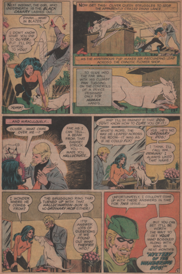 Nestled in the last few pages, is a really cool back-up story starring the emerald archer himself, Green Arrow! This strange story shows us a cute little dog named Krypto, a bunch of skeevy smugglers, and if that wasn’t enough, we see an out of control Black Canary karate chop Krypto on the neck! Elliot S! Maggin again scripting, and Mike Grell on art is a real treat!