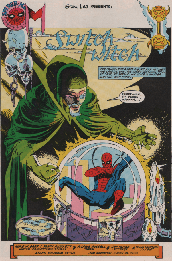 It’s once again time to talk a walk on the Strange side of Marvel Comics! The title Marvel Fanfare was one that not only featured some up and coming creators, but also characters that didn’t get a ton of airplay or were displaced from a title, with no home. The first story (“Switch Witch”, by Mike Barr – plot/script, Sandy Plunkett – pencils/plot, P. Craig Russell – inks, Jim Novak – letters, and Petra Goldberg – colors)does have Spider-Man in it, but the story also features The Scarlet Witch, and the evil sorcerer Xandu! It’s a tale where Xandu uses his sorcery to place Wanda’s soul inside the body of Melinda Morrison, in the Death Dimension. All because Melinda had previously died (but he kept her body “warm”…yes, creepy) and wants to marry her.