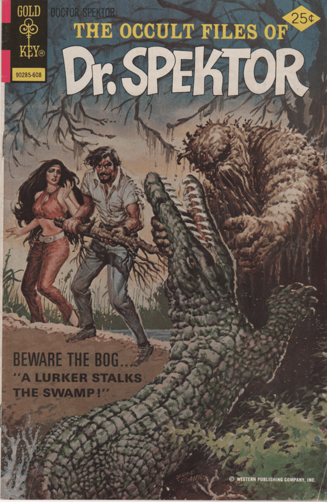 Sometimes you just have to take a look at something off the beaten path. Even if it’s in an ancillary way, like in this case. Anyone that’s a fan of this blog knows how I feel about swamp monsters. I prefer the Marvel version but also like the DC counterpart. One other version is The Lurker of the Swamp! In his Gold Key issue of Dr. Spektor, we see not only a crazy swamp monster, but a meteorite that can hypnotize people, and of course a fight between said monster and an alligator. Few know this comic book fact, but every time a swamp monster crosses paths with an alligator, they must fight.