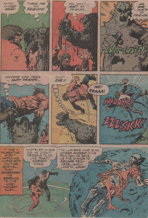 Sometimes you just have to take a look at something off the beaten path. Even if it’s in an ancillary way, like in this case. Anyone that’s a fan of this blog knows how I feel about swamp monsters. I prefer the Marvel version but also like the DC counterpart. One other version is The Lurker of the Swamp! In his Gold Key issue of Dr. Spektor, we see not only a crazy swamp monster, but a meteorite that can hypnotize people, and of course a fight between said monster and an alligator. Few know this comic book fact, but every time a swamp monster crosses paths with an alligator, they must fight.