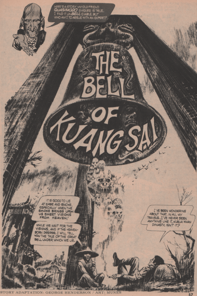 Lastly, we see “The Bell of Kuang Sai.” An ancient bell, ordered to be built by the powerful leader Kublai Khan! The metal workers from his kingdom are told the greatest bell of all time must be built in his honor. The metal worker tries repeatedly to make one, but it always cracks. He then summons the spirits of the gods, to aid him. The result is not what he had hoped for! Written by George Henderson and art by Munes!