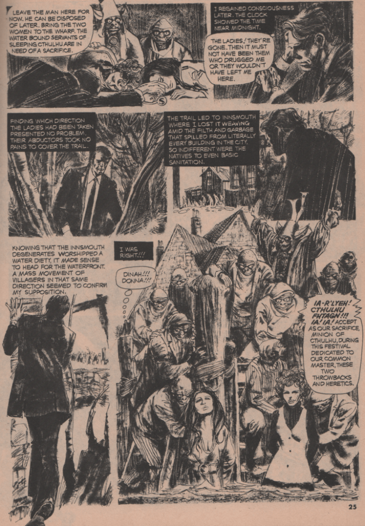 “Innsmouth Festival” is next, and this one is straight out of the mind of H.P. Lovecraft! As we know, Innsmouth is a familiar setting for his stories, and also for this one as well! A reporter is sent to a small New England town to investigate and interview two ladies that say the town has a secret! It doesn’t take the skeptic long to figure out that they’re on the level! Written by John Jacobson, with art by Adolfo Abellan.