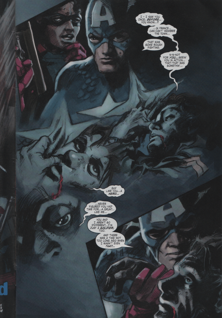The story starts out in Bastogne, France in 1945, with Cap, Bucky, and their unit, as they’ve discovered some other soldiers that were killed, but there’s something different about the way in which they were killed. Cap and Bucky wait and eventually see that the soldiers rise and are now part of a vampire legion! Cap and Bucky must now battle against men that served by their side, and not only that, but townspeople as well, including children!