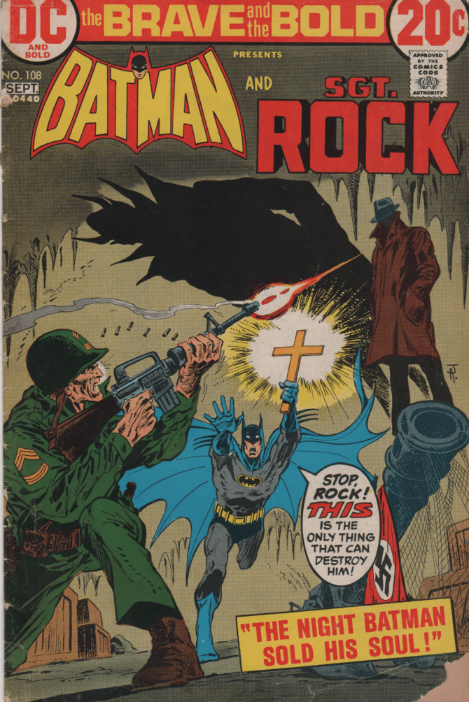 Somewhere up near the Canadian border, Batman has cornered a kidnapper. The guy has a kid, but Batman insists it’s not who the kidnapper believes it is, so there will be no ransom. The kidnapper is losing his mind, so Batman attempts to jump through a window to try and surprise him, but it doesn’t work. The kidnapper shoots Batman, then for some odd reason dumps him in a well. As batman is coming to, he’s helped out of the well by some cloaked stranger. The man has a hat on as well, so you cannot see his face. Batman thanks him for the assist, then heads back to apprehend Mad Dog Dorn (the kidnapper). After returning to Gotham, and his guise as Bruce Wayne, he then slumps over in an alleyway, still reeling from the wounds from the gunshot. As he’s trying to get up, that same cloaked figure appears, and tells him that he owes him for the help he gave him in the well. Wayne tells him he owes him nothing and the strangers tells him that his soul now belongs to him! As the man shuffles away, Wayne attempts to catch up. He does, or so he thinks, and grabs a man in the foggy street, but that man was also following after the cloaked figure. The man Wayne grabbed turns out to be none other than Sgt. Rock! Rock then reveals the identity of this mysterious figure, and Wayne cannot believe it!