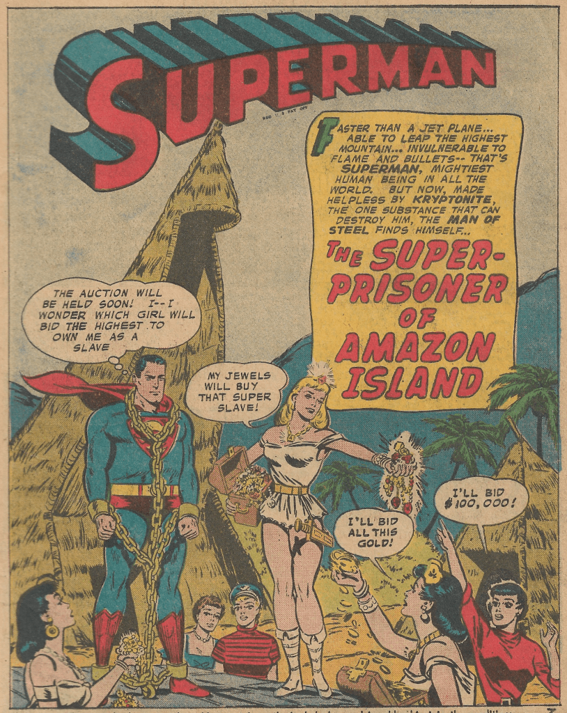 The first story, “The Super-Prisoner of Amazon Island,” doesn’t (unfortunately) feature Wonder Woman, but it does show an island full of Amazon women that have captured the Man of Steel, and are intent on auctioning him off to the highest bidder. Story by Otto Binder, art by Wayne Boring and Stan Kaye.
