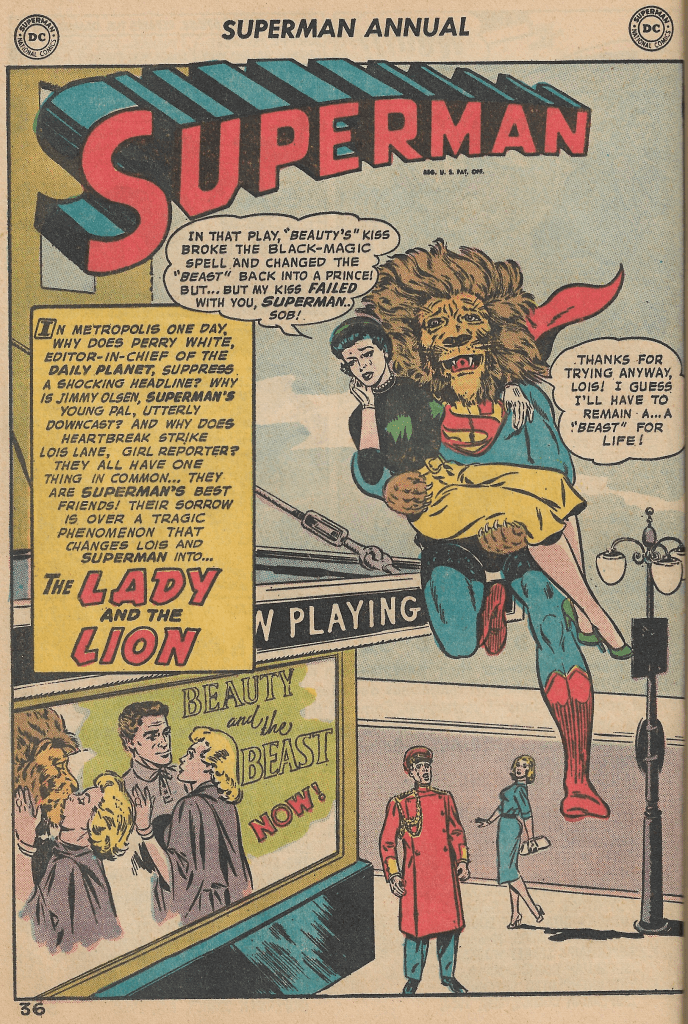 The Lady and the Lion,” is up next, and this might be the gem of the book. And by gem I mean the highest concentration of insanity. In this one, Superman is duped by Circe into drinking a formula that will turn him into a lion if he doesn’t return and agree to be her mate! Written by Otto Binder, art by Wayne Boring and Stan Kaye.