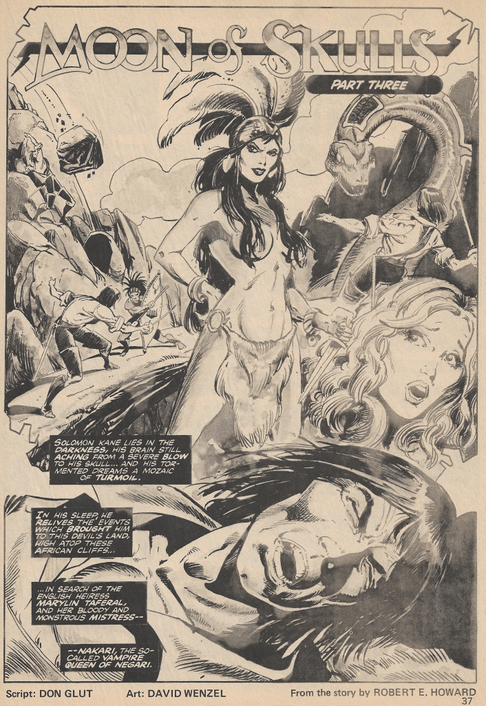 The second story, “Moon of Skulls,” is actually part three of a story that took place in two other issues, so I won’t go into detail on that one. Let’s just say Solomon Kane is in big trouble and is at the mercy of a vampire queen! Script by Don Glut, art by David Wenzel.