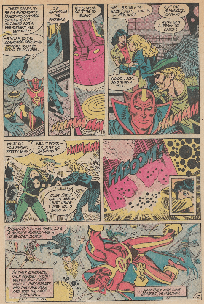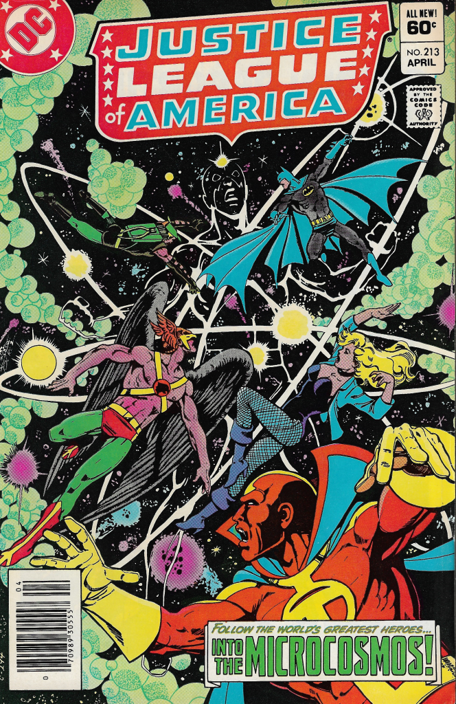In this story (part one of a multipart story), we see The Atom, as he’s struggling to remember who he is, as he tumbles through the microcosmos. The scene then switches to the Justice League Satellite orbiting the Earth, and Hawkman trying to explain to the other League members what happened. He tells them that Ray’s wife called him to ask for help, because Ray went off the deep end and had a nervous breakdown. Hawkman shows up at his lab to help, but he’s too far gone, and attacks Hawkman. He turns into the Atom, and shrinks into miniature size. He then vanished into this microcosmos (a sub-atomic world). So, Batman, Green Arrow, Black Canary, Hawkman, and Red Tornado all use the machine to shrink down and go after their disturbed comrade. They do not realize though, that the trip messes with ones mind, and basically turns you into an amnesiac. So now not only do they have to find their friend, they need to figure out who they are!