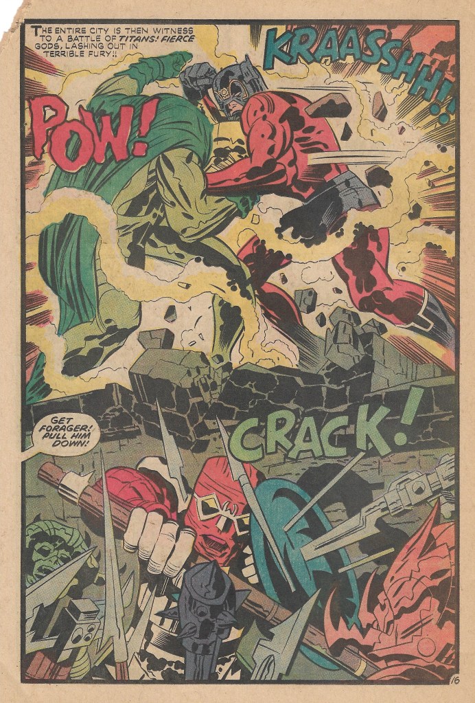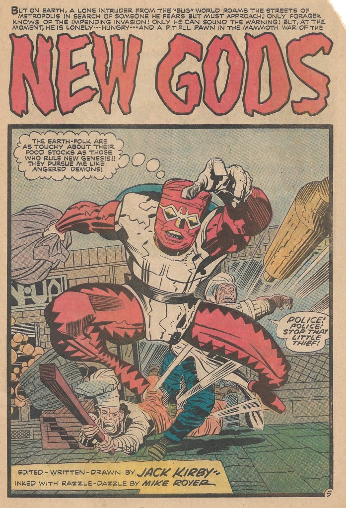 The issue begins with a prelude, as some baddies watch a cocoon like object glowing. They remark that it is the great Mantis himself, and how with him as a leader, how can they fail? Mantis then emerges from the cocoon, and tells his minions to “prepare for the great destiny that awaits them!” We then get a Forager appearance, followed by some ominous words from my personal favorite New God, Orion!