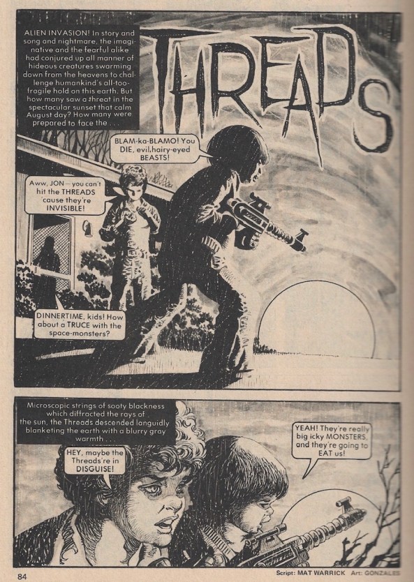 Finally, the story “Threads” closes out the issue and series. Two children using a toy laser gun are playing together. They get called in for dinner. The television tells the viewers there are atmospheric disturbances occurring, and things get darker from there. Written by Mat Warrick, with art by Adrian Gonzales!