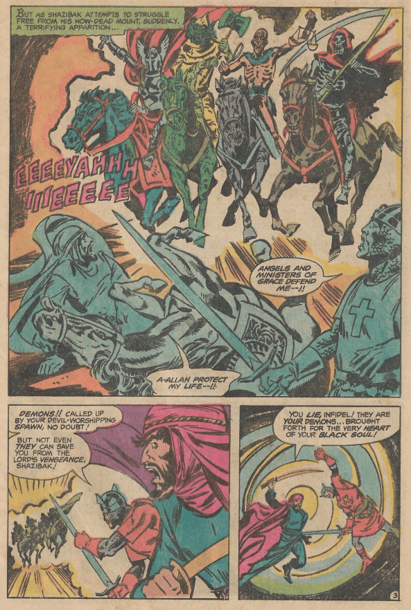 The first story “The Ravaging Riders of Ruin!” we see a battle during the Crusades. In a war for Holy Land, these warring factions are brutal. As these two savage armies fight, a ghost brigade appears, and the crap really hits the fan. One of the Arabs and one of the Catholic warriors get pulled into some underground chamber, and are greeted by Prester John! He warns them of an imbalance that they’ve created, and that it must be corrected! It is then up to these two men to rid the underworld of the Four Horsemen of the Apocalypse (referred to as the “Riders of War”)! Written by Cary Burkett, art by Tom Sutton, letters by Ben Oda, with colors by Adrienne Roy.