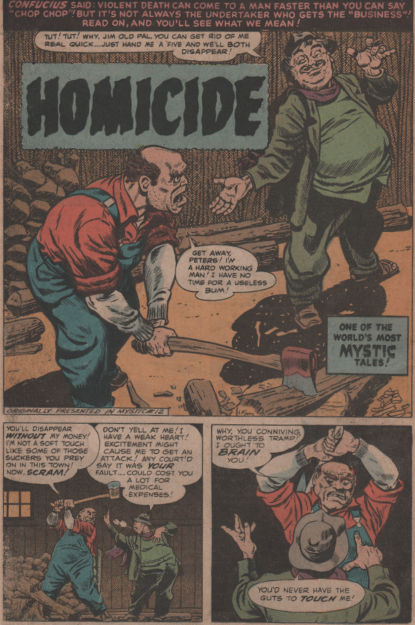 Next up is a reprint from the Golden Age (Journey into Mystery 1, 1952). “Iron-Head” is a story about a seedy guy that does whatever he can to survive, including murder for money! He spends time on a ship, diving for treasure, but then gets the idea that he can take out the middle men and have all the money for himself! He blows up the ship, and gets the last but most lucrative chest for himself. He then makes his way to a nearby island, but the local natives aren’t very kind to strangers! Art by Dick Ayers!