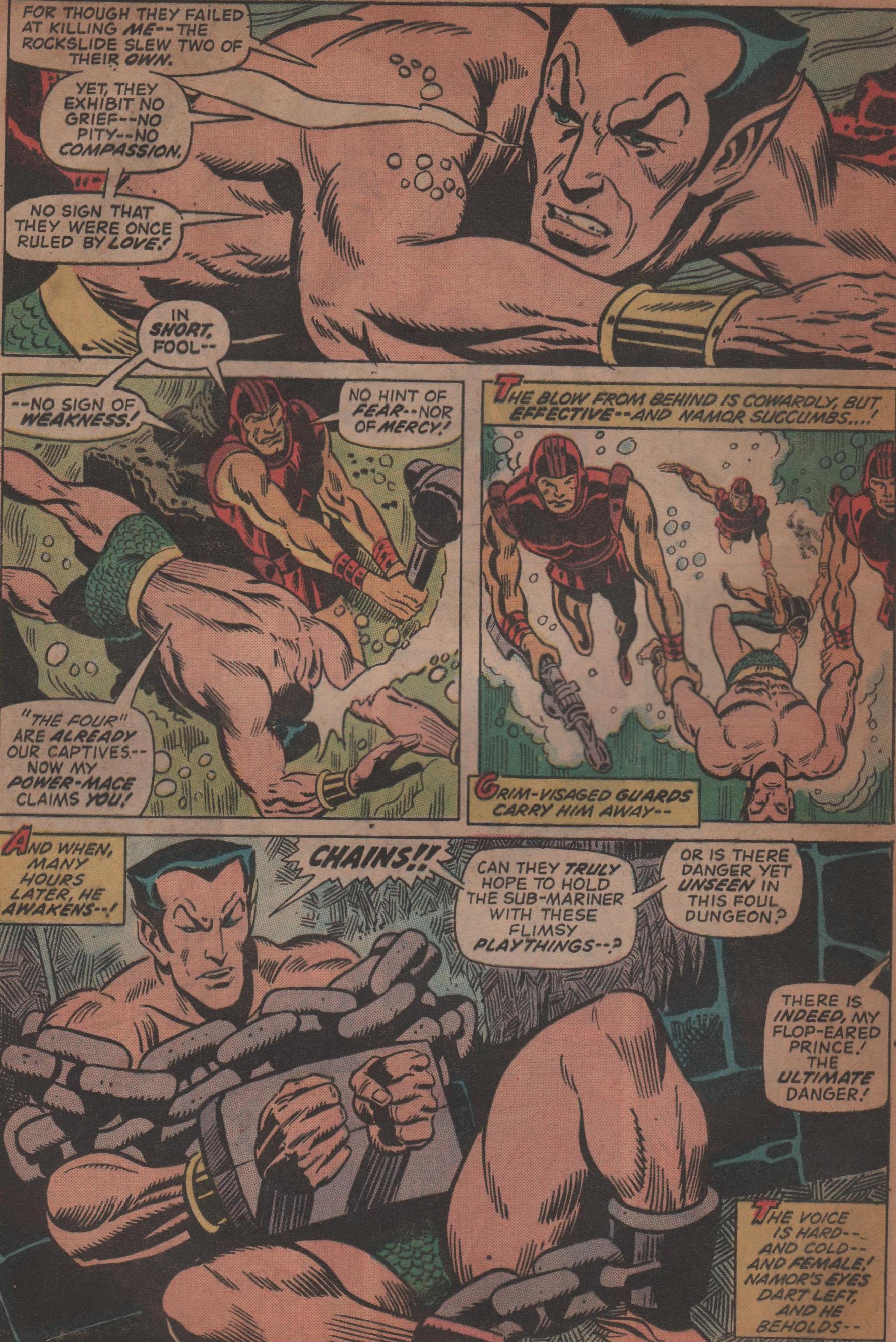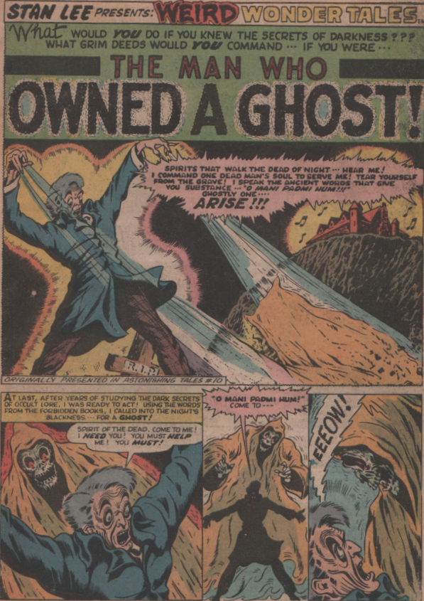 The zombie stories in this magazines are three-fold. The first, “Altar of the Damned,” shows the second appearance of the character in comics. In this one, we see voodoo rituals, and some sleazy guy (“Gyps“) controlling the whole thing in order to get control of Simon Garth. This story (art by John Buscema and Tom Palmer) serves as sort of a precursor to the second story, which is actually the very first appearance of the character (Zombie! A Man Without a Soul! in Menace 5, 1953, story by Stan Lee and art by Bill Everett). So, in short, they did a retroactive continuity (retcon) story to flesh out the character for the readers. Not a bad idea, but one that has been beaten like a dead horse since (especially in more modern comics).