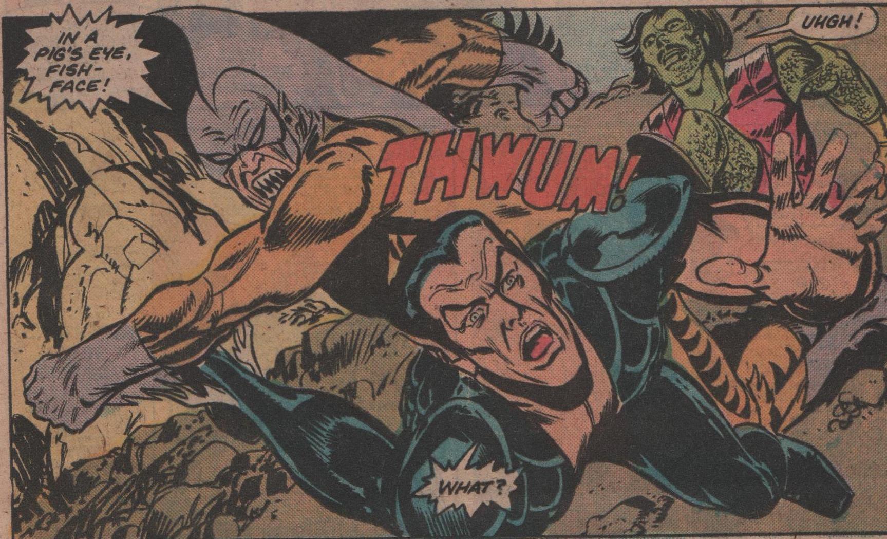 The bookend story for Simon Garth, “Night of the Walking Dead!,” picks up where the first half left off, as the sleazy Gyps is dead, and Donna Garth identifies him for the coroner. She then obtains the voodoo coin from the police, and immediately gets a bad feeling. Meanwhile, in the graveyard, we see something or someone, stirring. Simon Garth rises from his grave, and is attacked by a dog (with a hunter). He kills the animal brutally, then makes his way towards the coin, as if its calling to him. Written by Steve “Baby” Gerber, art by “Big” John Buscema and Syd Shores.