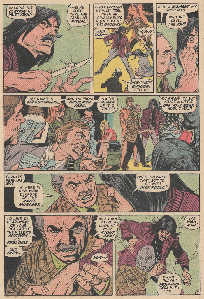 We all know the story of Jack the Ripper, but this one is slightly different. The scene opens in Greenwich Village (not London), and John Carmody, Sir Guy Hollis, and a beat cop have discovered a young woman, who’s been murdered by “The Slasher.” The police are baffled as to who could be committing these murders, and it looks as though they aren’t going to stop any time soon. Sir Guy has an interesting theory, though. He believes this is the work of Jack the Ripper! Sir Guy believes that Jack is a practitioner of the dark arts, and that’s how he’s still alive today. Written by Ron Goulart(based on a story by Robert Bloch), art by Gil Kane and Ralph Reese, edited by Roy Thomas.