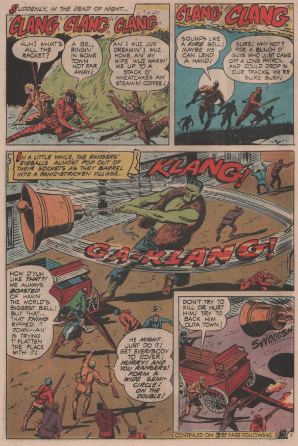 The next story is (from the cover), “Rocky, the Genius Challenger.” In this one, Wizard Welles builds a machine that can transfer information from a computer into the mid of a human being. Before he can do it to himself, though, Rocky knocks him out of the way, and takes the brain boost himself. His cranium then grows to twice the normal size, and his brain power is now beyond any person on earth. Shenanigans with the team and the Wizard ensue. The awesome art is again by Bob Brown (an unsung hero of comics to be sure). The writing credits are possibly by Arnold Drake (Deadman, Doom Patrol).