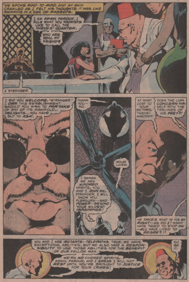 This reprint book gives us a tale from the youth of Professor Charles Xavier. But first, he’s talking with Lilandra in his office. You see, the X-Men are missing and presumed dead (after an altercation in the Savage Land). He then begins to think that maybe he should never have recruited them for his cause. His mind drifts back to a trip he made to Cairo years ago. As he was walking through the city, a girl (a young Ororo Monroe, A.K.A. Storm!) stole his wallet. He chased the girl down, and retrieved his wallet, but was struck down by a mental attack. He then makes his way inside a cafe to meet the person responsible. He then comes face to face with Amahl Farouk. He is a mutant, and a very powerful telepath, just like Xavier. The difference is that he’s evil, and uses his powers for personal gain. After a quick introduction, they meet on the Astral Plane for combat. The battle is fierce, but eventually, Xavier proves to be the superior combatant!