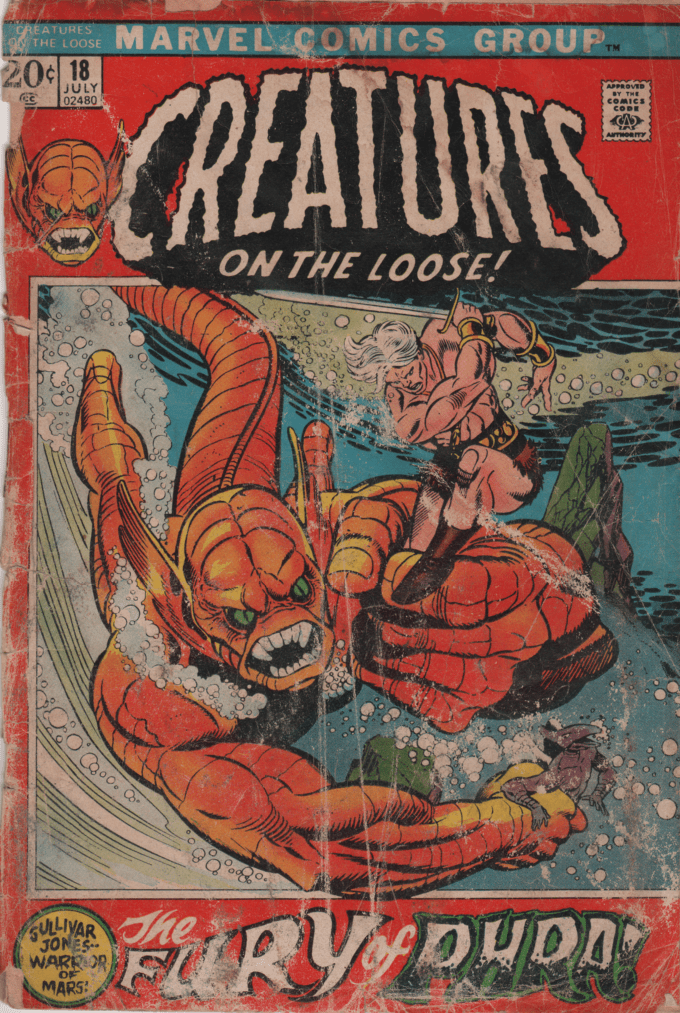 The titles of horror comics Marvel produced in the late Silver and early Bronze Age (and everyone else mainstream) were pretty tame, thanks (no thanks really) to the Comics Code Authority. Some good material for sure, just nothing cutting edge until the CCA was toned down. One of those titles was Tower of Shadows, but that was later changed to Creatures on the Loose. At first it served as just another vehicle to reprint older stories, but in issue sixteen, we saw a character called Gullivar Jones Warrior of Mars take over. The run of stories for this character didn’t last long, but they were pretty cool. Basically a clone of John Carter, Jones fought on other worlds against fantastical beasts and despots, often with no real agenda. Alas, the stories aren’t Earth-shattering, but the visuals definitely make them worth checking out.