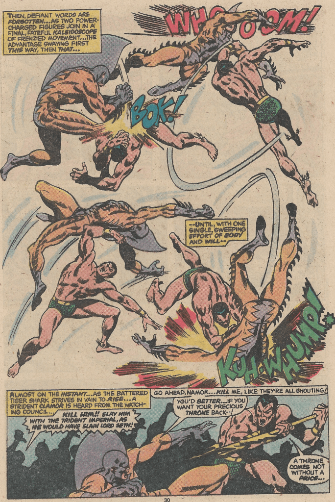 At the end of issue five, Tiger Shark got the upper hand on Subby, and not only knocked him out for a brief minute, but was also able to kidnap Lady Dorma as well (she appeared out of nowhere near the base, after Subby thought her dead in the previous issue)! Diane Arliss (Tiger Sharks sister), comes to the aid of Subby, but he initially thinks it’s Tiger Shark, and knocks her out. He swims to the surface and finds Dr. Dorcas, head bandaged and looking weary. He tells him to treat her wounds and that he’s know going after her brother. The two then have a showdown in front of all of Atlantis to see who will rule!