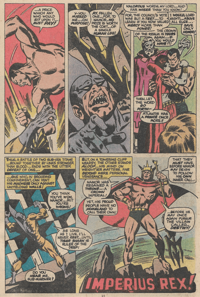 In 1968 (when these stories were first printed), Roy Thomas (writer) was really cementing himself as the heir apparent to Stan Lee as Marvel’s premiere writer/editor-to-be. This story has a ton of gravitas, and really pulls you into the world of Namor. Yeah, the guy can be a huge, arrogant jerk, but he does have a code of honor, and will fight for his people and justice. He obviously wasn’t written in 1968 to have the best manners towards the ladies, but I think we can all agree it wasn’t written that way with malicious intent. Issue five has art by “Big” John Buscema and Frank Giacoia (inks), and is all sorts of awesome, but in truth, the following issue has Big John penciling again, but Dan Adkins on inks, and looks a good bit superior. Letters by Sam Rosen (5), and Irv Watanabe (6) and colors by Bob Sharen (not originally but in the reprint).