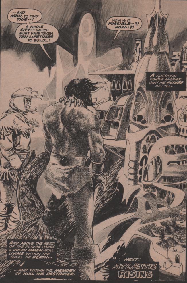 The last regular issue of this series is upon us. Only one more issue to go after this one (Giant Size Special 1), and it does make me a a little sad, as I’ve been enjoying blogging about them immensely. That being said, let us traverse this issue, which has a brilliant cover by Frank Brunner, and the inside cover has a very awesome piece by Pat Broderick!