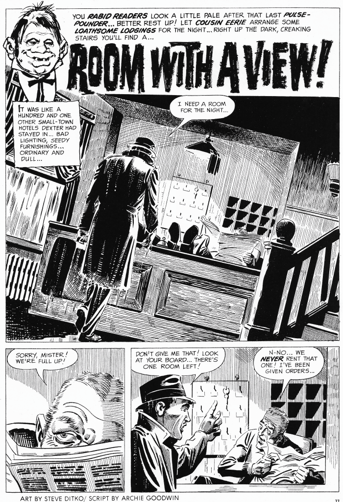 In this, the last week of ‘Stevecember’, it is with great pleasure that I’m spotlighting another chapter from this beautiful archive of horror/fantasy stories by Steve Ditko. Last I looked, this awesome hardcover was still available on places like Amazon, so definitely look for it ASAP, as I’m sure it wont last long! Now, I present, “Room with a View.”