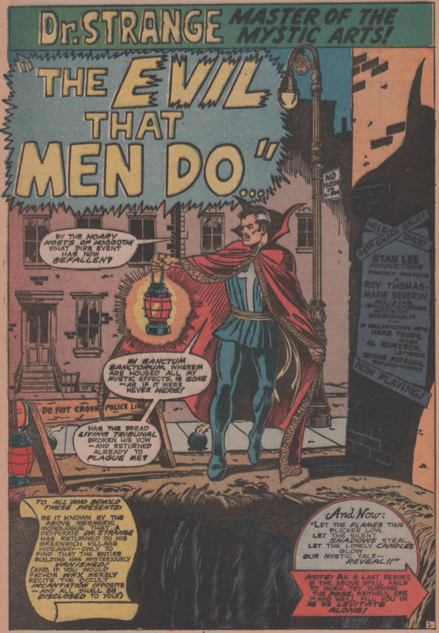The second story is another chapter in the life of Doctor Strange! The Doc returns home to find that his Sanctum Sanctorum has been leveled, by none other than Umar herself! Once he finds a counter-spell to bring his home back, he then sets out to fight a band of sorcerers that are attempting to bring back Baron Mordo! Written by Roy Thomas, art by Marie Severin and Herb Trimpe, and letters by Al Kurzrok.
