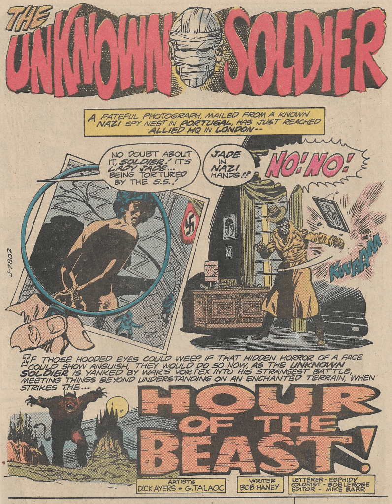 The first story, starring The Unknown Soldier, is absolutely nuts. Lady Jade has been captured by the Nazis, and being tortured, and the Unknown Soldier is not happy about it. He then finds out that he’s indirectly responsible for the betrayal that lead to her capture. She’s being held in a castle…in France…by Japanese soldiers (not sure how many Japanese soldiers were in France, but let’s not parse hairs here). His superiors tell him his orders are to stay put, but he knocks out the two MP’s taking him outside, and makes a b-line for Jade. He decides that this time, he must not just use a disguise, but it must be “a complete metamorphosis.” He then disguises himself as a hunchbacked SS torture expert, and heads to the castle. As he attempts to rescue her, his disguise is removed, and the chase is on. Now, this is where the story gets really crazy. As the pair are running down a hallway, Jade is possessed by a spirit that also changes her appearance. After introducing herself she tells him he must don a suit that’s hanging in the hallway of a demon (resembling a Satanic figure). He puts it on, and they both kill all of the Nazis in brutal fashion. Then they walk away arm in arm, while inside the castle, the woman/ghost that possessed Jade remarks to the demon that they might be needed again someday.