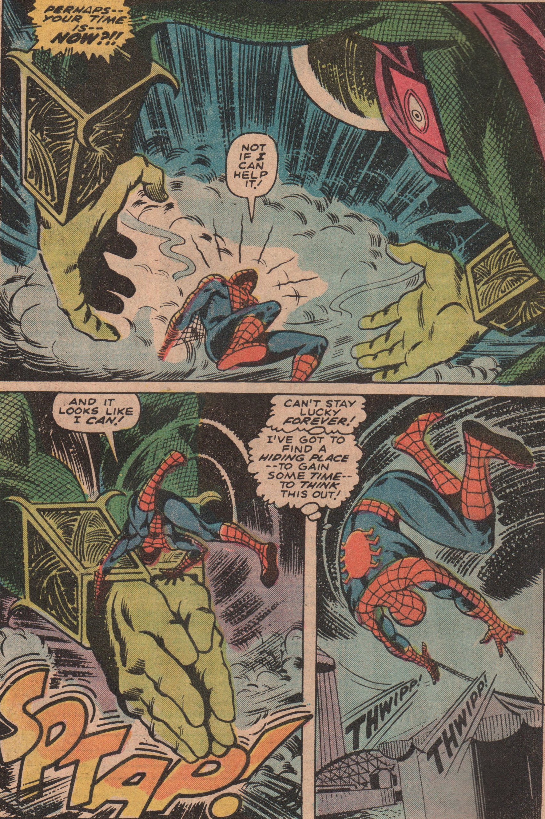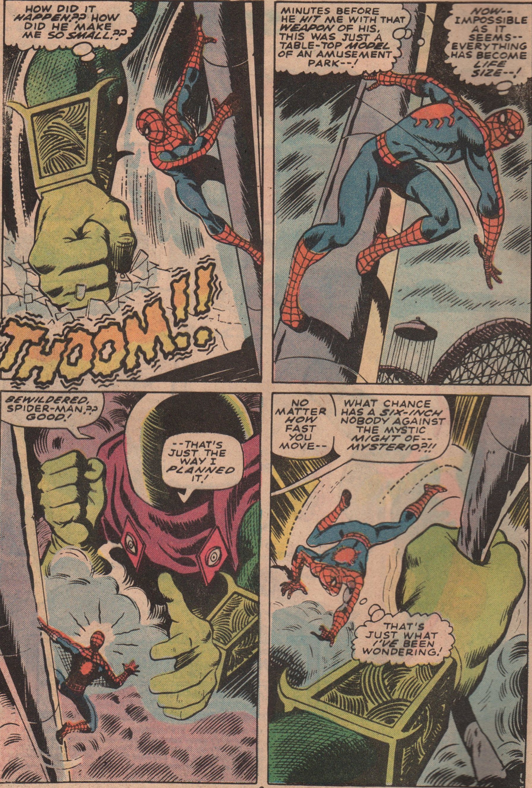 After recently purchasing this issue, I checked it out and knew I had to spotlight it for everyone to see! This story features a battle between Spidey and Mysterio! We now know that his forté is illusions, but back then, it wasn’t common knowledge. The story shows a miniature version of Spidey (six inches tall), having to fight his way through a fun house, all the while Mysterio is trying to kill him! There is some back matter as well. We see Joe Robertson having some issues with his son, and Gwen and her father, Captain Stacy. Great stuff, as the real world touches are what made Marvel tops!