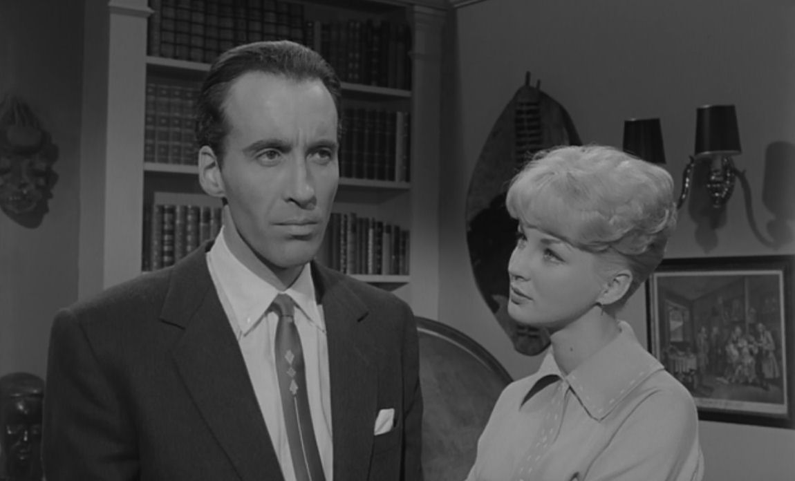 The film begins with a witch, Elizabeth Selwyn (Patricia Jessel) being burned at the stake for her unholy actions. One man in the crowd (Puritans?), Jethrow Keane (Valentine Dyall), seems to have a connection to her, and calls out to the devil to help her. It doesn’t seem to help much though, and she’s apparently toast. Fast forward to modern times, and Professor Alan Driscoll (Christopher Lee), is lecturing some students about these very matters. One student in particular, Nan Barlow (Venetia Stevenson), is very receptive to the subject. Her boyfriend, Bill Maitland (Tom Naylor), thinks it’s a bunch of nonsense, and this angers Driscoll.