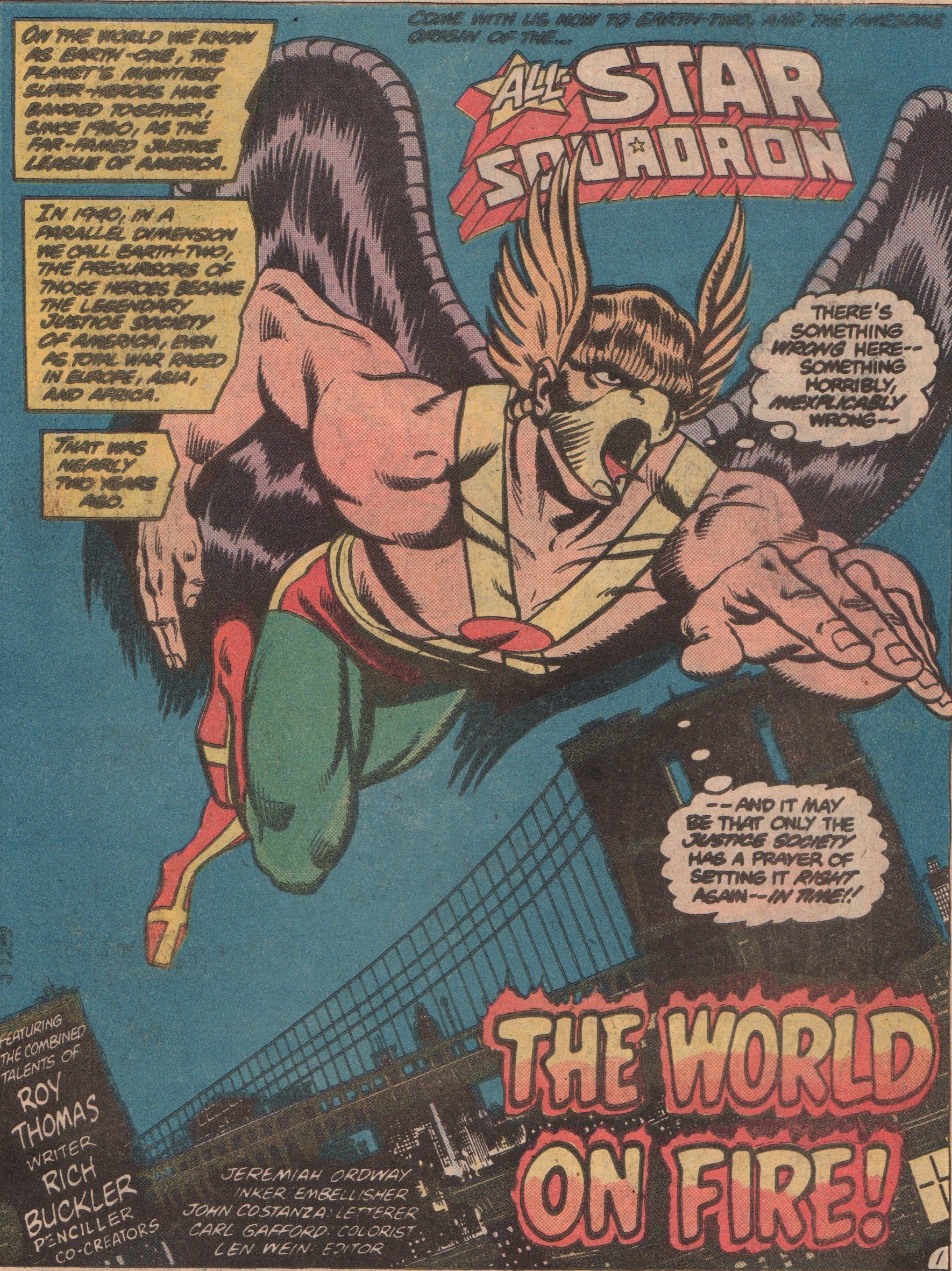 Secondly, we have All-Star Squadron! A period piece starring some of the Golden and Silver Age heroes that were a part of the JSA (Justice Society of America). Hawkman, Atom, and Dr. Mid-Nite are joined by Plastic Man, Robotman, Liberty Belle, and Johnny Quick, as they meet the POTUS, FDR, as he helps them create a new super team, to fight against the Axis powers in WWII! But, before that they need to find some missing members of the JSA as well! The creative team is one of legend, as Roy Thomas (writer), Rich Buckler (pencils), and Jerry Ordway (inks) brought a fantastic new comic book to the shelves!