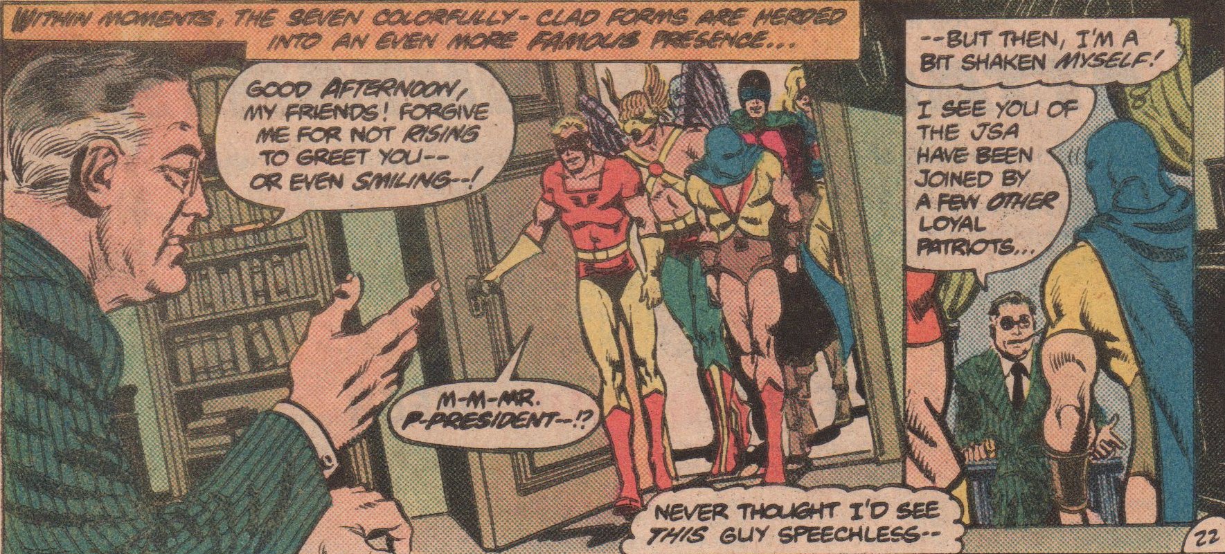 This one isn’t even close. A good WWII story with a myriad of characters that come together to fight Nazis, plus save other heroes from Solomon Grundy, Professor Zodiak, Sky Pirate, Degaton, and Wotan! Don’t get me wrong, Barr tells a good story in the other title, but it’s just not on par with this one by Roy “the boy” Thomas. Oh, and FDR (image below) is in this comic, so that seals it!