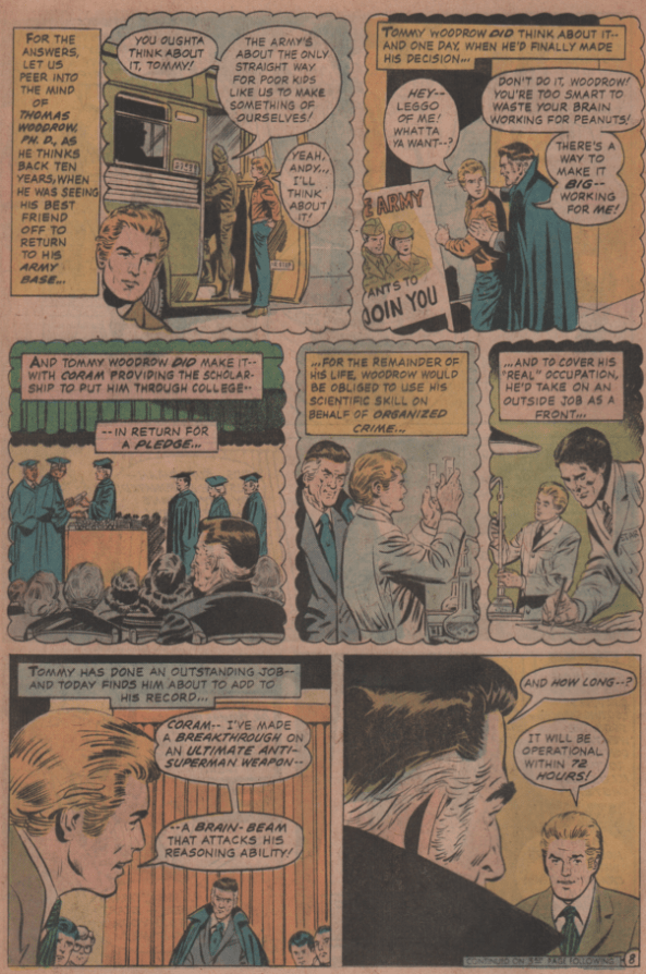Inside we are treated to a very interesting story that involves a gentleman in a cape named Michael J. Coram, as he attempts to recruit two boys for some mysterious means. As Superman is taking care of some villains, we see a flashback of this Coram, as he approaches a man named Woodrow, about to join the Army. The man is a brilliant scientist, and Corman knows he can use this man’s intelligence for nefarious means! What are those means? Why to destroy Superman of course!