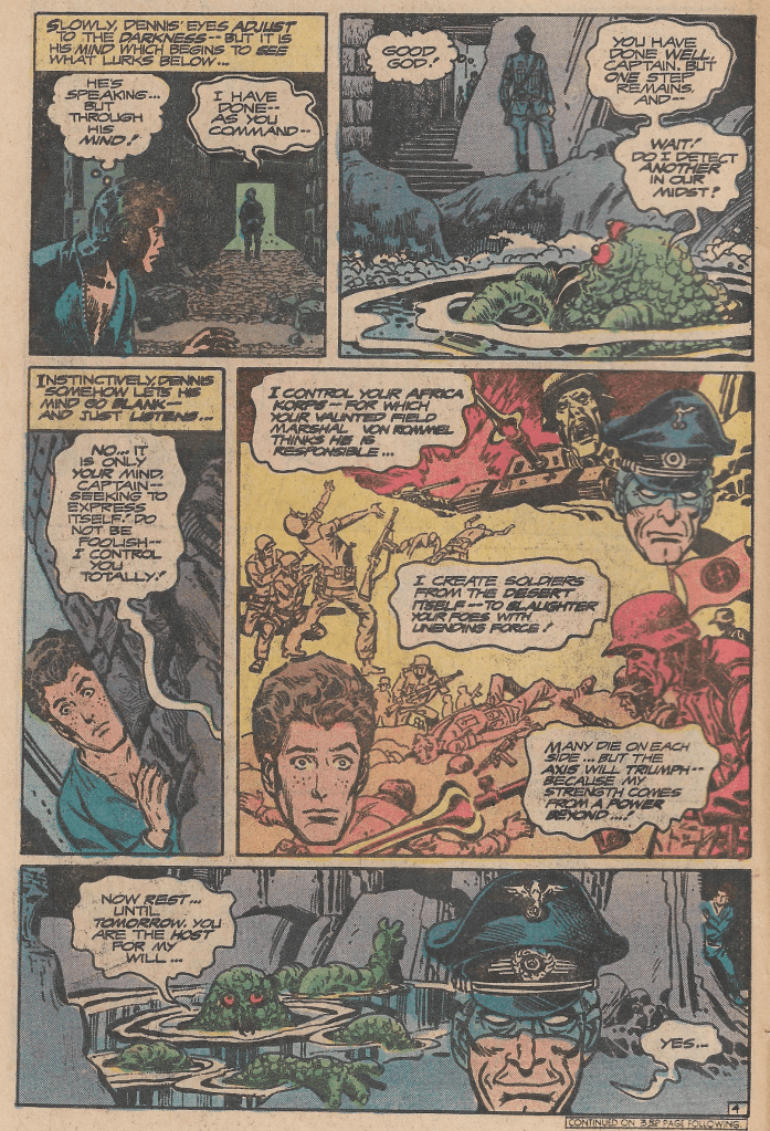 As Death explains, we see three brothers from Baytown, in their youth, displaying feats of amazing psychic abilities. A newspaper then shows how each brother joined a separate branch of the military, and are heading to fight the Axis powers. First up, we watch as Lt. Dennis Reeves of the United States Navy is on a mission in the north Atlantic with American and British Frogmen, as they are planting bombs on the underside of Nazi ships. Dennis then doesn’t get far enough away and gets blasted from the ship, and knocked unconscious. He awakens on the shores of an island, and spots a Nazi fortress! He infiltrates the building, and using his psychic powers can feel a force that should not be there. He descends into the bowels of the fortress, and sees a Nazi commander communing with an unspeakable beast in the depths of the water. After getting captured, but then escaping, Dennis manages to get an explosive device and hurl it at the beast!