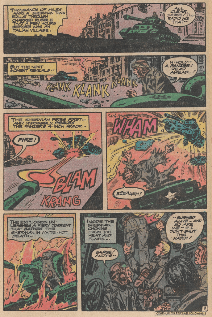 Half a world away, in a small Italian village, Sgt. Joe Reeves sees one of his men brutally killed in a tank attack. Before they know it, they’re caught in a fire fight and things don’t look good. On top of that, their tank gets stuck in a bog! Just then a skiff with a Japanese soldier comes by and they grab him and pull him inside the tank. He seems like he’s in a trance, and Joe uses his psychic powers to ascertain that he’s possessed by something inhuman. Again, the same unholy beast (or another that resembles it) from the desert fortress rises from the bog and attempts to destroy the soldiers. Joe decides to use the canon and then sets the tank forward to ram the beast. He jumps out at the last second, and swims to the shoreline. We see an enormous explosion, and the monster looks disposed of.